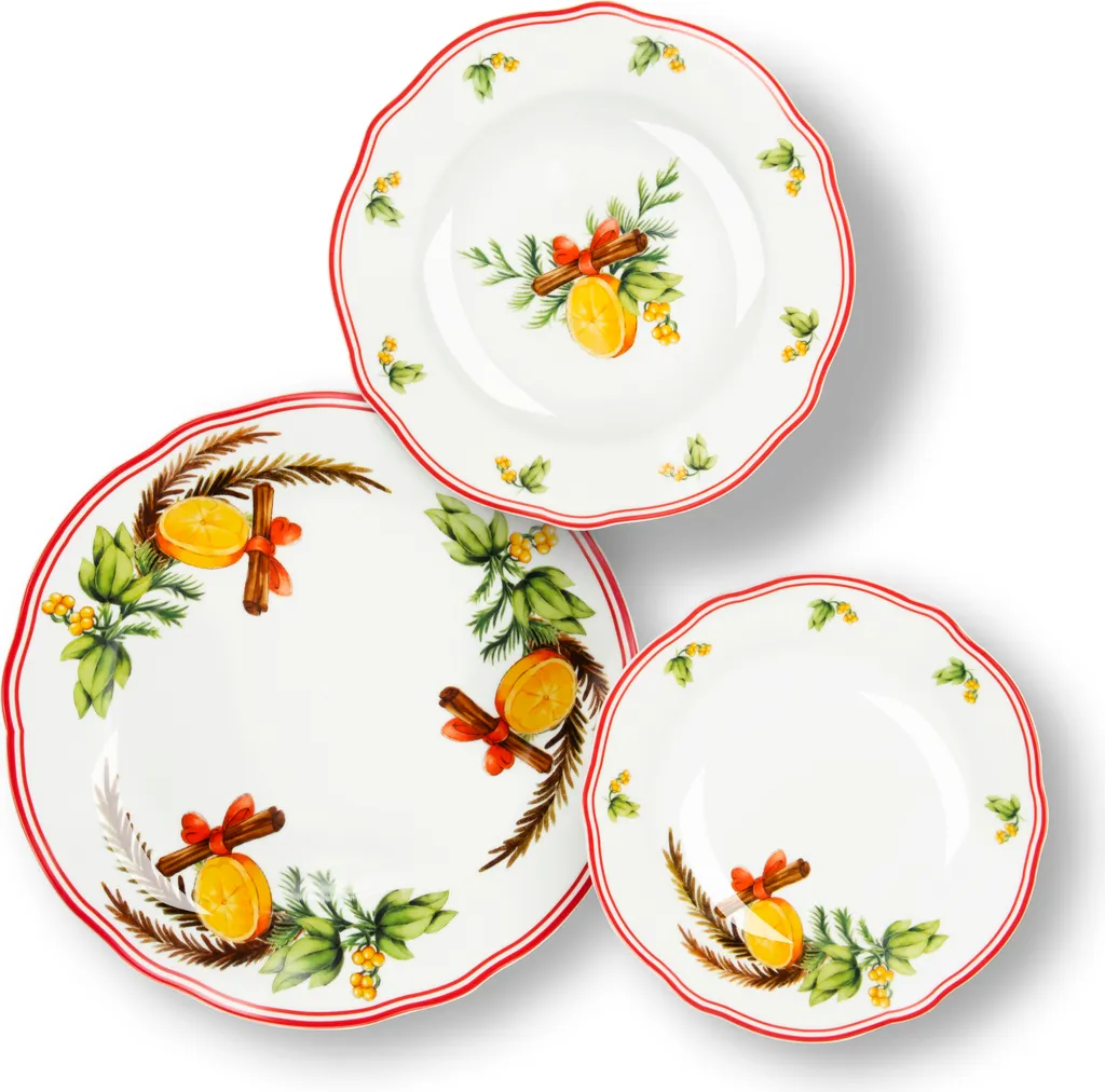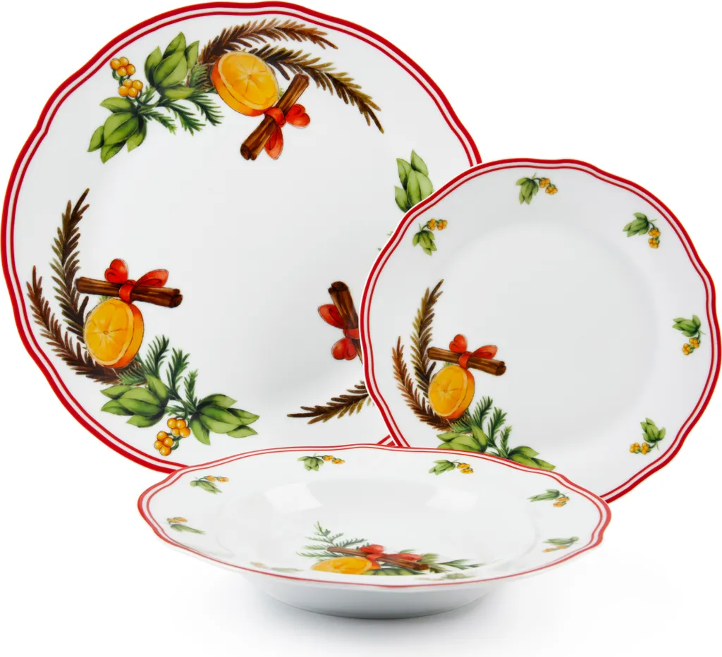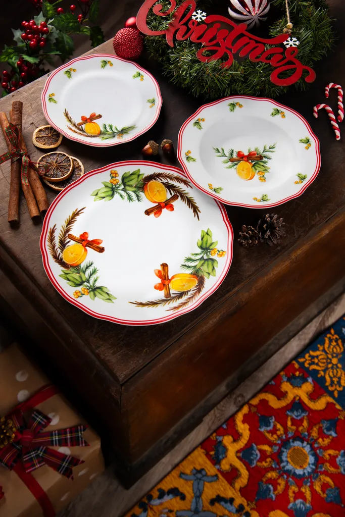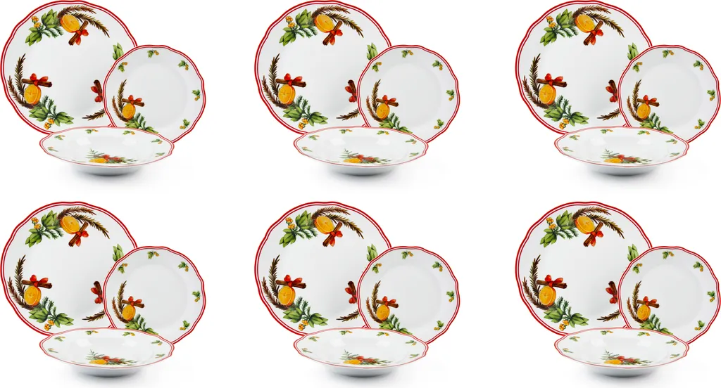 Откройте для себя волшебство вечеринки с коллекцией Cinnamon от Excelsa, набором столовой посуды из 18 предметов, который превратит любую сервировку стола в уникальное и уютное событие. Этот изысканный дизайн идеально подходит для 6 человек и украшен элегантным рождественским декором с дольками апельсина, палочками корицы, ягодами и сосновыми ветками, обрамленными красным зубчатым ободом, который вызывает тепло праздников. Изготовленные из высококачественного фарфора, обеденные, суповые и десертные тарелки долговечны, подходят для использования в микроволновой печи и посудомоечной машине, предлагая практичность и функциональность. Выбирайте Cinnamon от Excelsa и сделайте каждое рождественское событие незабываемым, превратив обед в момент радости и веселья.