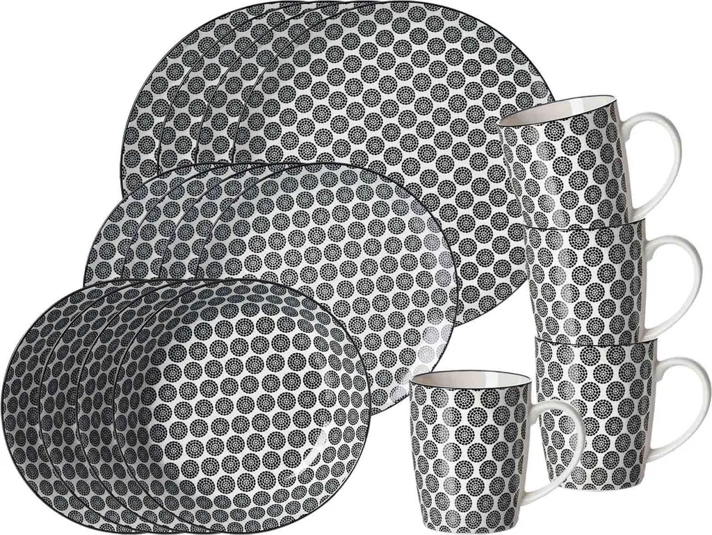 Комплект поставки: 4 десертные тарелки, 4 суповые тарелки, 4 обеденные тарелки, 4 кружки