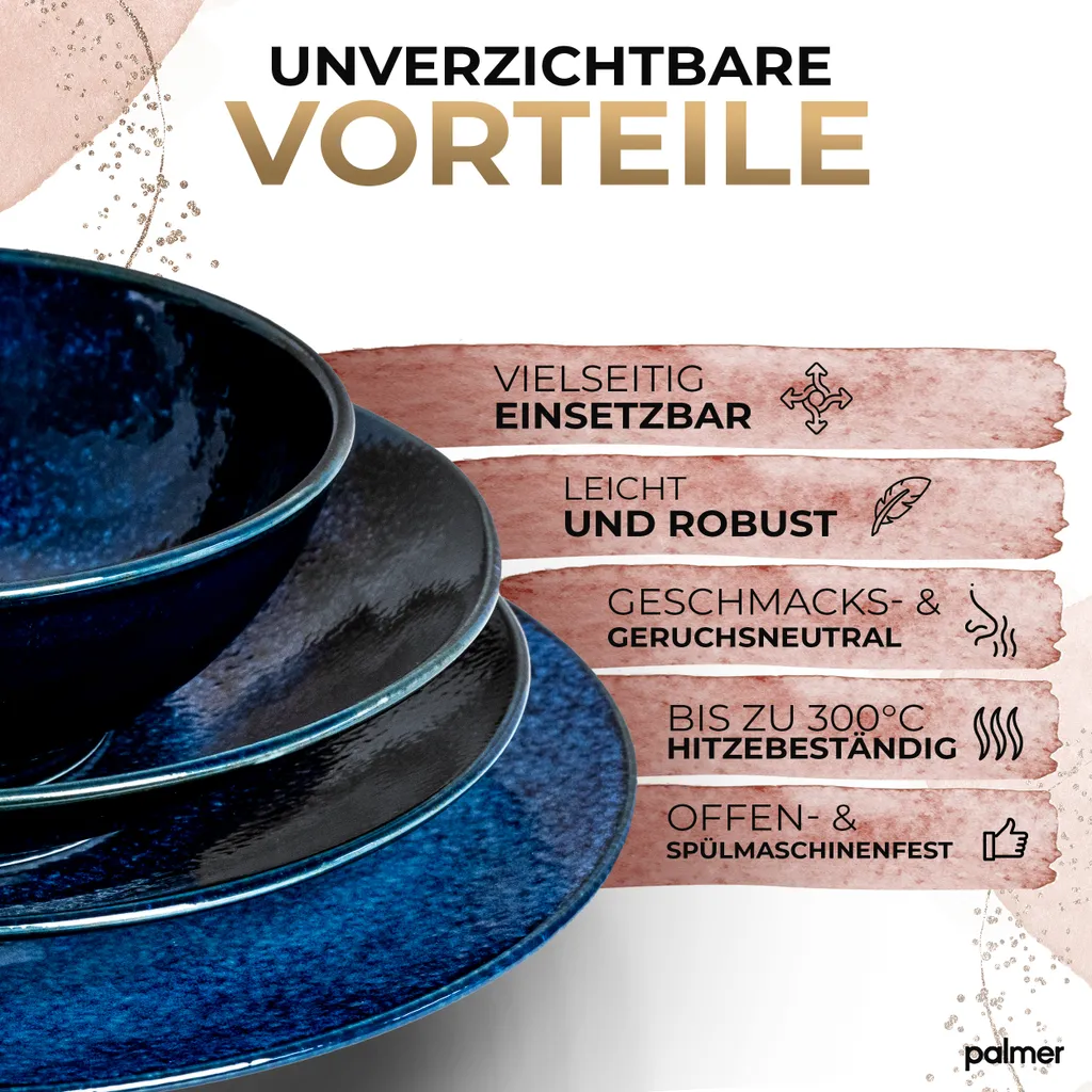 В Palmer мы настоящие ценители вкусной еды, поэтому, помимо идеально приготовленных блюд, мы уделяем большое внимание их подаче. Наш широкий выбор чашек, тарелок и мисок доказывает, что столовая посуда может быть не только функциональной. Ведь внешний вид - это главное, и наши уникальные фарфоровые изделия создают поистине неповторимый образ. Наш фарфоровый сервиз обжигается при температуре 1380 °C. Эта высокая температура обеспечивает исключительную прочность посуды и прекрасный внешний вид. Помимо потрясающего внешнего вида, этот метод обеспечивает особую прочность и долговечность посуды. Особенностью фарфоровой посуды является ее легкость: фарфор невероятно легкий и элегантный. Наш фарфоровый сервиз идеально подходит для повседневного использования и легко моется вручную или в посудомоечной машине. Этот сервиз подходит для использования в микроволновой печи и выдерживает температуру до 220 °C, что делает его невероятно универсальным. Фарфор не имеет запаха и вкуса, поэтому он никак не повлияет на восхитительный вкус ваших блюд. Этот темно-синий сервиз ручной работы на шесть персон в дизайне KIRYU включает шесть обеденных тарелок (диаметр 27,5 см), шесть тарелок для завтрака (диаметр 23,5 см), шесть тарелок для пасты (диаметр 22 см) и шесть мисок (диаметр 14 см). Фарфоровый сервиз впечатляет своей элегантной цветовой гаммой. Оживите свою кухню и пробудите все чувства с помощью нашей фарфоровой посуды. Этот современный сервиз станет прекрасным дополнением, которое дополнит интерьер многих кухонь или создаст эффектный контраст. Palmer - с любовью к еде.