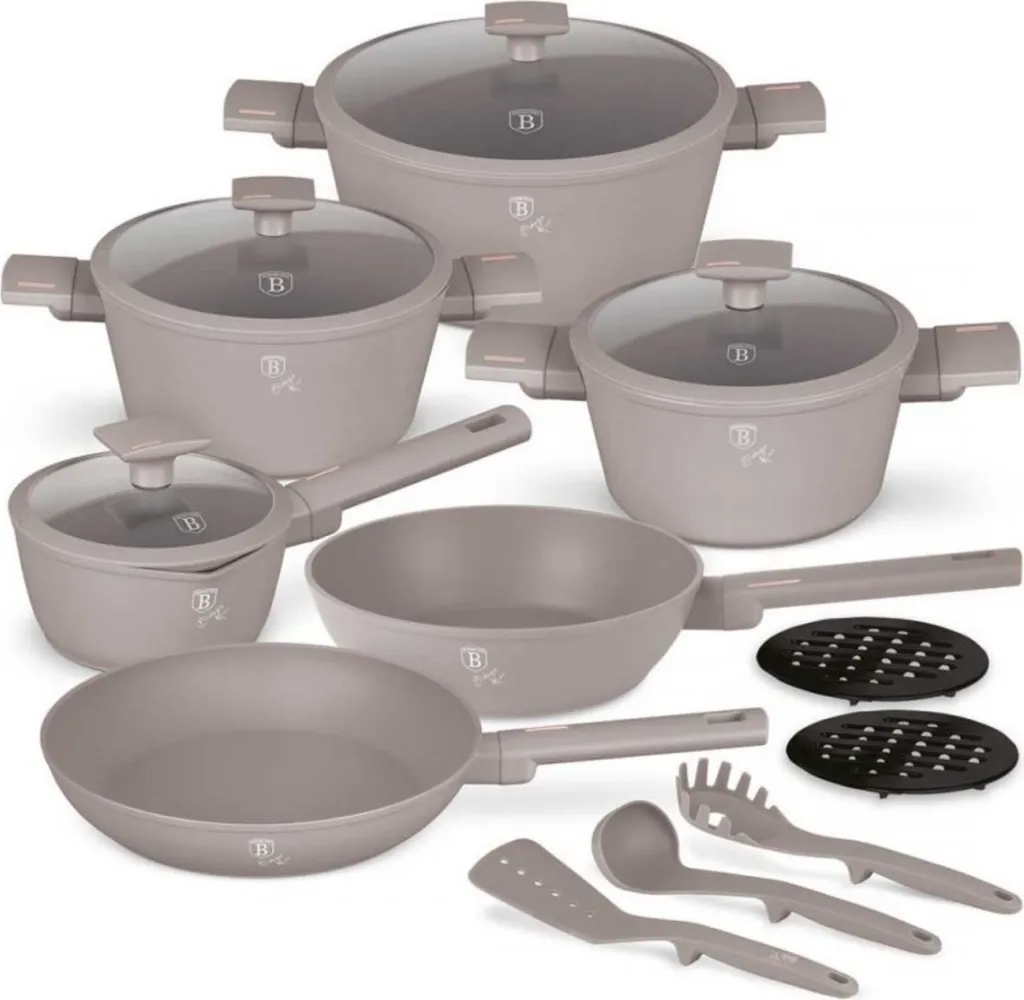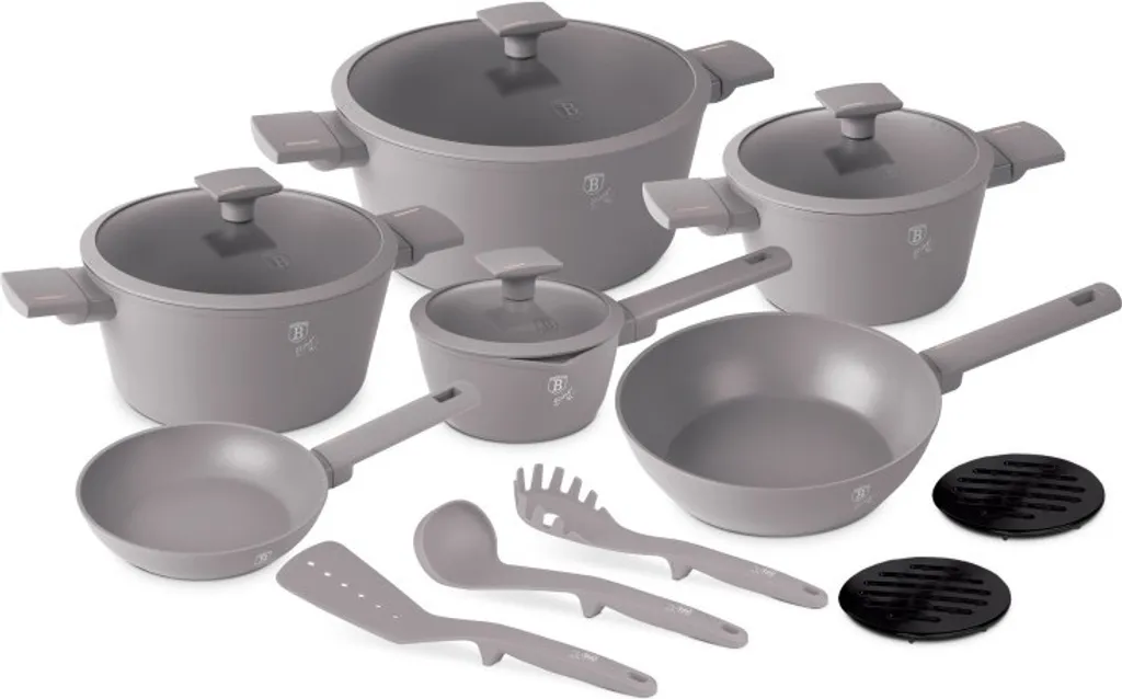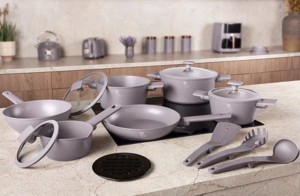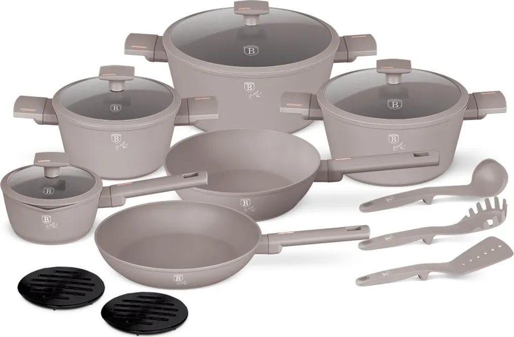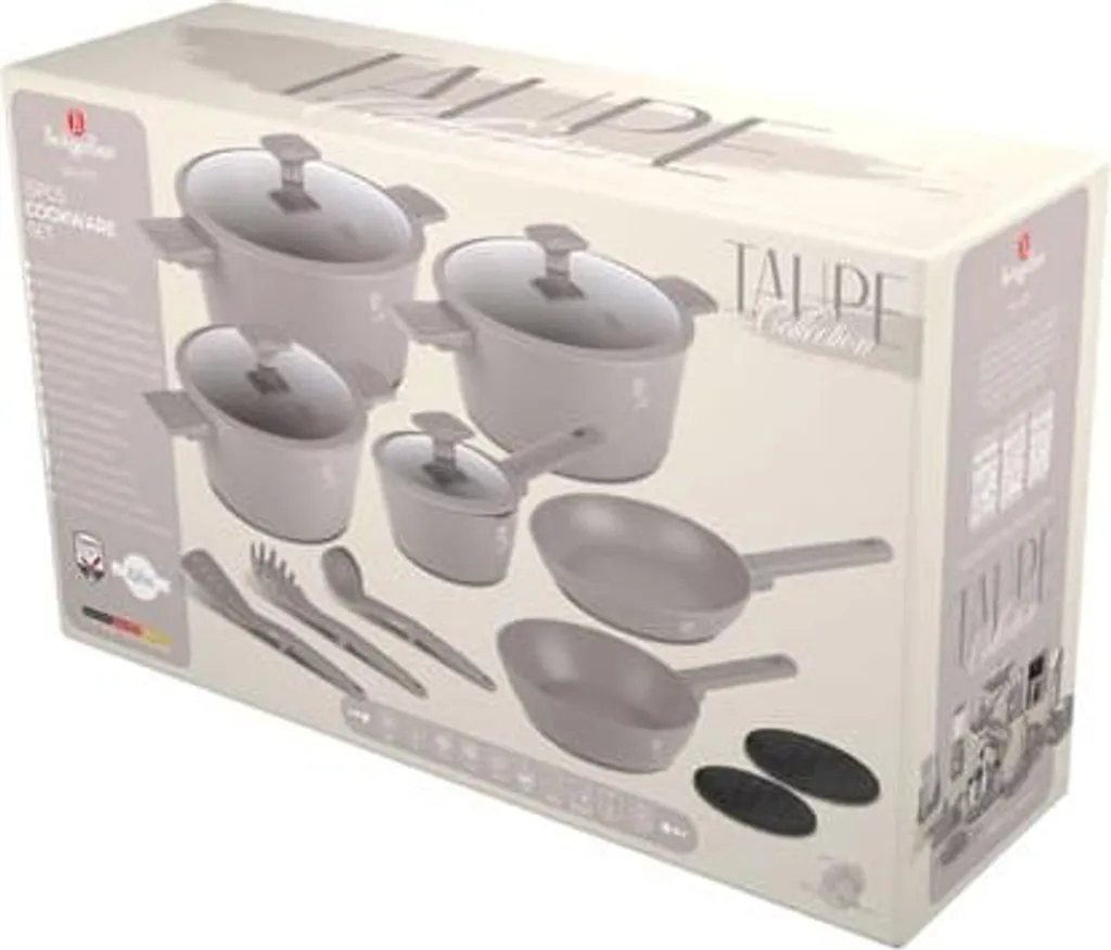 Кастрюли, сковородки и аксессуары серии BERLINGER HAUS TAUPE COLLECTION изготовлены из высококачественного алюминия и имеют тройное титановое покрытие TYTAN PRO с очень высоким коэффициентом твердости внутри. Внешнее покрытие матово-серое. Эта привлекательная и стильная посуда стандартно комплектуется ручками с покрытием Soft-Touch (силикон). Подходит для всех типов плит: газовых, электрических, керамических, галогенных и индукционных. Система TURBO INDUCTION (очень быстрый нагрев) позволяет экономить до 35% энергии. В набор входит: Кастрюля с крышкой Ø20 x 10,5 см (2,5 л) Кастрюля с крышкой Ø24 x 11,8 см (4,1 л) Кастрюля с крышкой Ø28 x 12,5 см (6,1 л) Кастрюля с крышкой Ø16 x 7,2 см (1,2 л) Фритюрница Ø24 x 6,5 см (2,3 л) Сковорода Ø28 x 5,2 см (2,4 л) Набор кухонных принадлежностей (3 предмета)