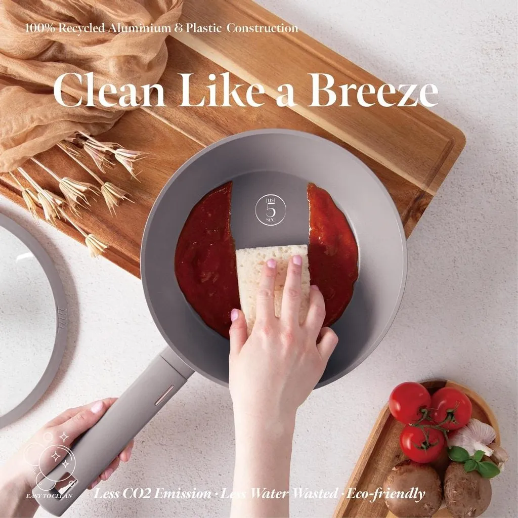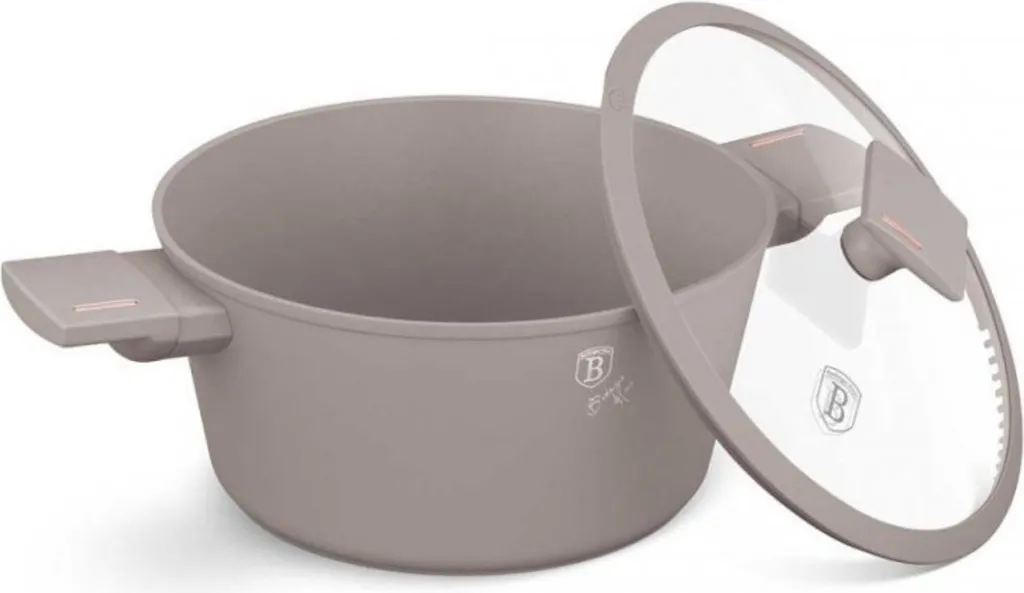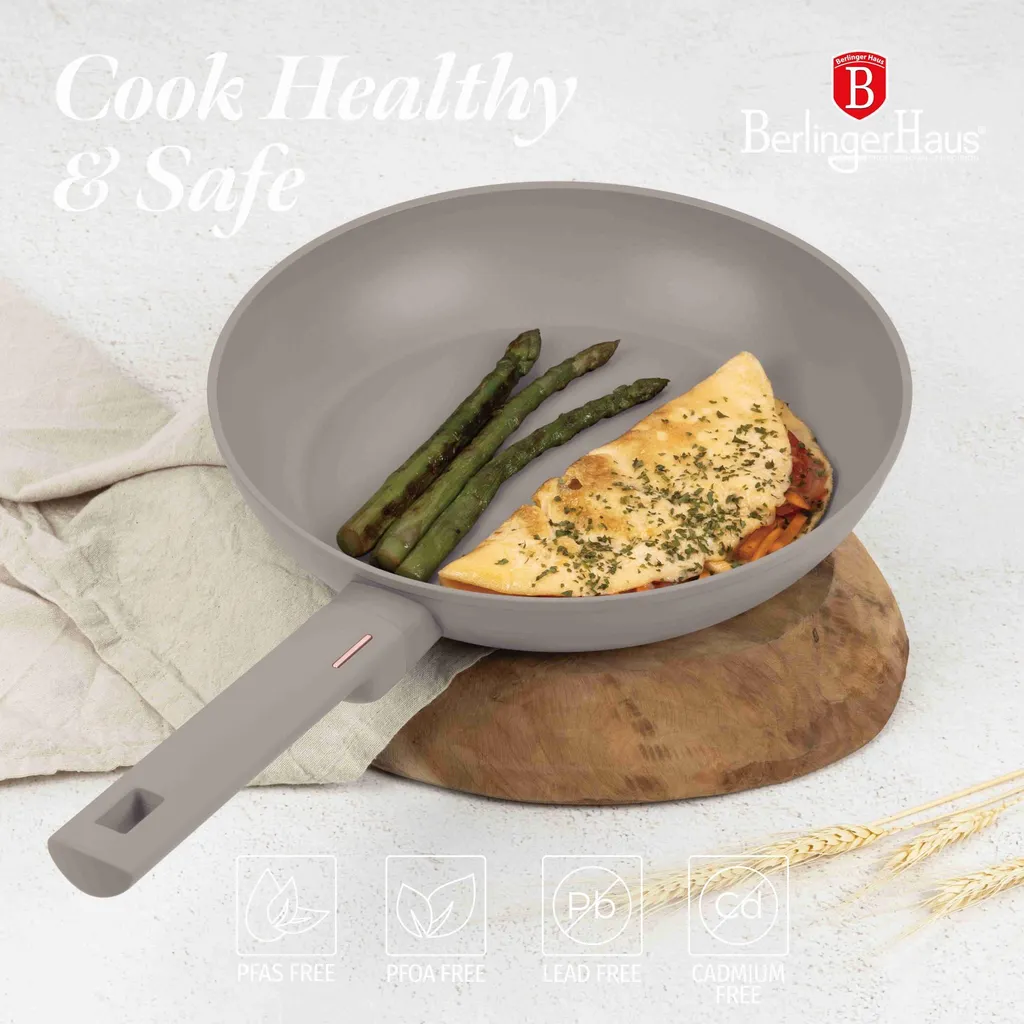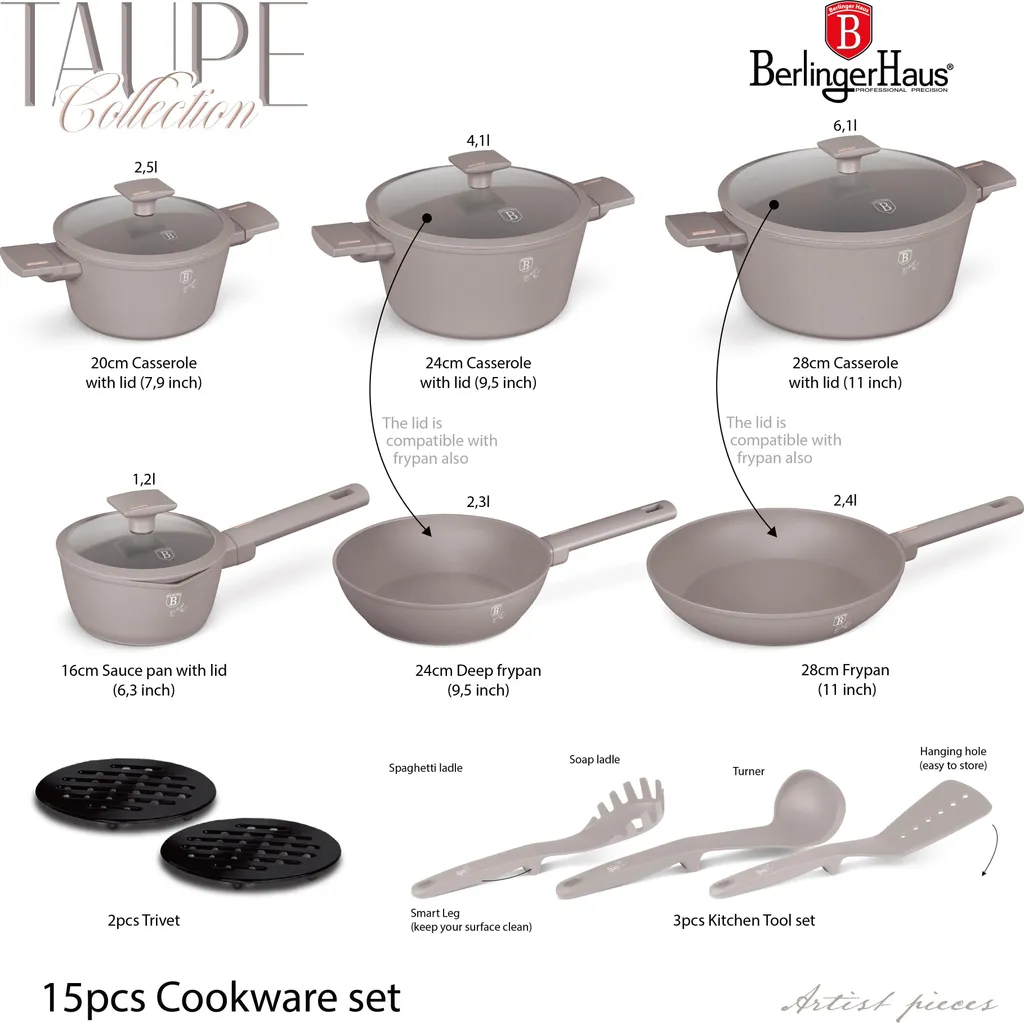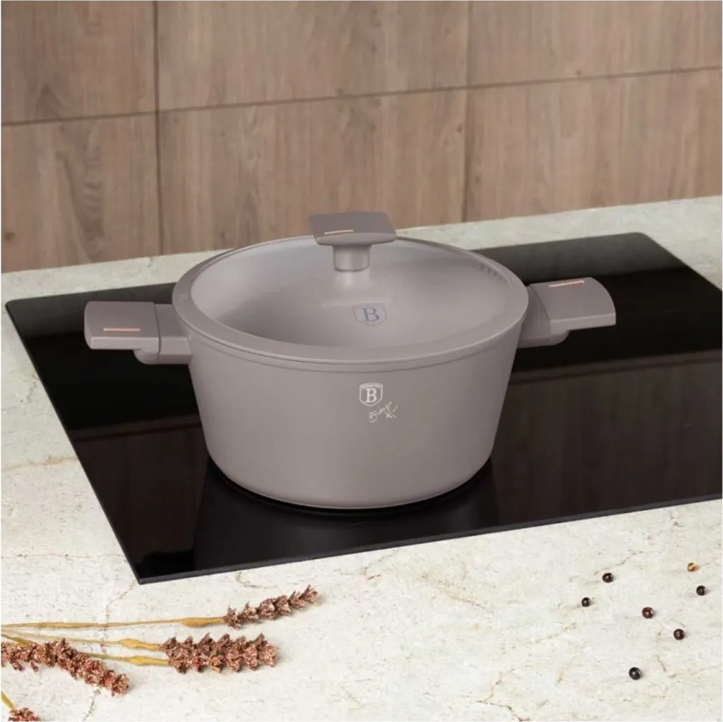 Кастрюли, сковородки и аксессуары серии BERLINGER HAUS TAUPE COLLECTION изготовлены из высококачественного алюминия и имеют тройное титановое покрытие TYTAN PRO с очень высоким коэффициентом твердости внутри. Внешнее покрытие матово-серое. Эта привлекательная и стильная посуда стандартно комплектуется ручками с покрытием Soft-Touch (силикон). Подходит для всех типов плит: газовых, электрических, керамических, галогенных и индукционных. Система TURBO INDUCTION (очень быстрый нагрев) позволяет экономить до 35% энергии. В набор входит: Кастрюля с крышкой Ø20 x 10,5 см (2,5 л) Кастрюля с крышкой Ø24 x 11,8 см (4,1 л) Кастрюля с крышкой Ø28 x 12,5 см (6,1 л) Кастрюля с крышкой Ø16 x 7,2 см (1,2 л) Фритюрница Ø24 x 6,5 см (2,3 л) Сковорода Ø28 x 5,2 см (2,4 л) Набор кухонных принадлежностей (3 предмета)