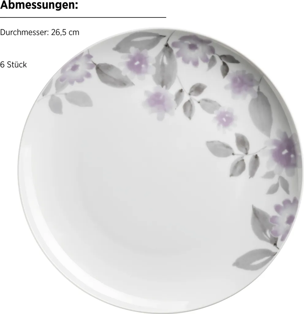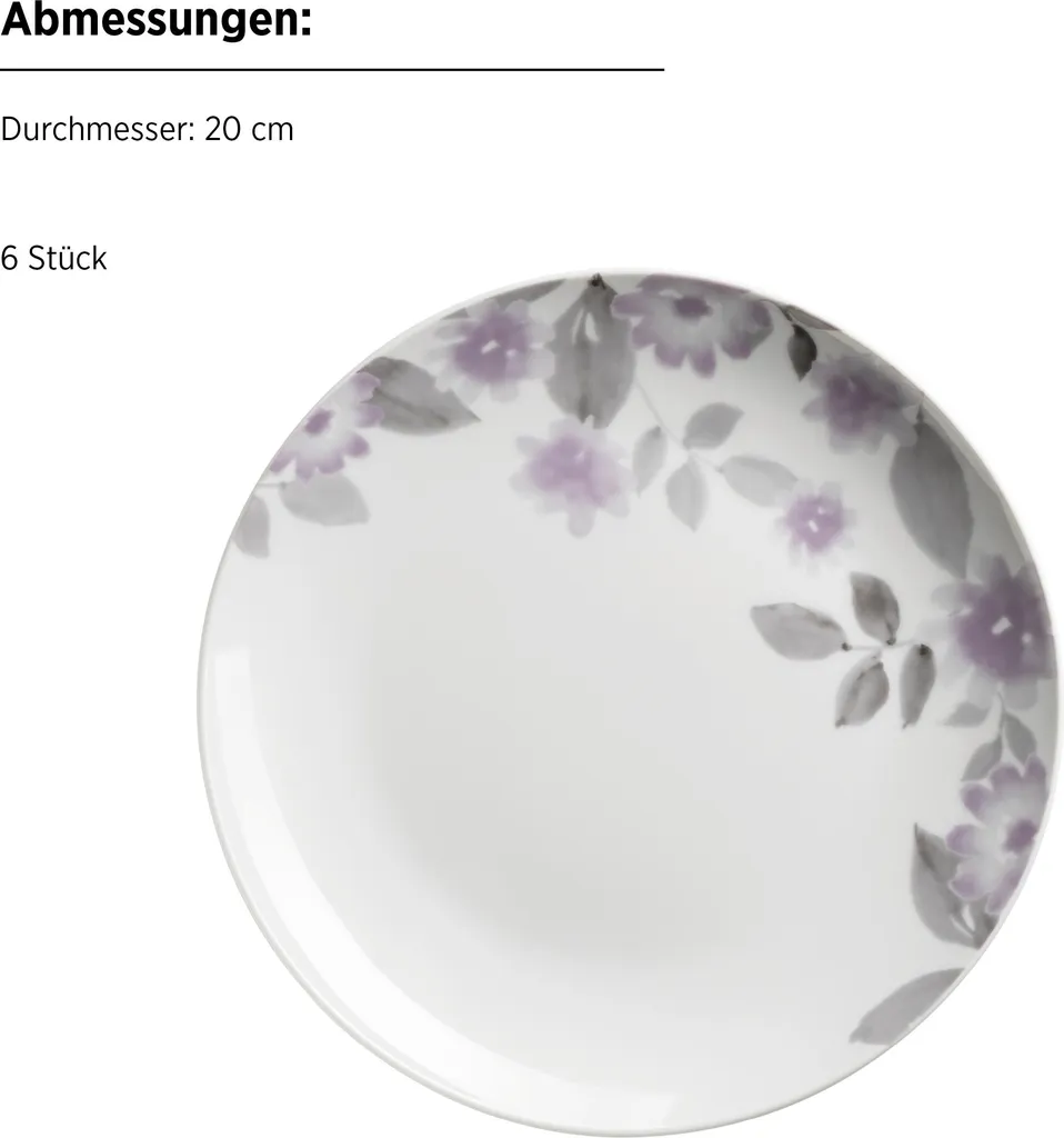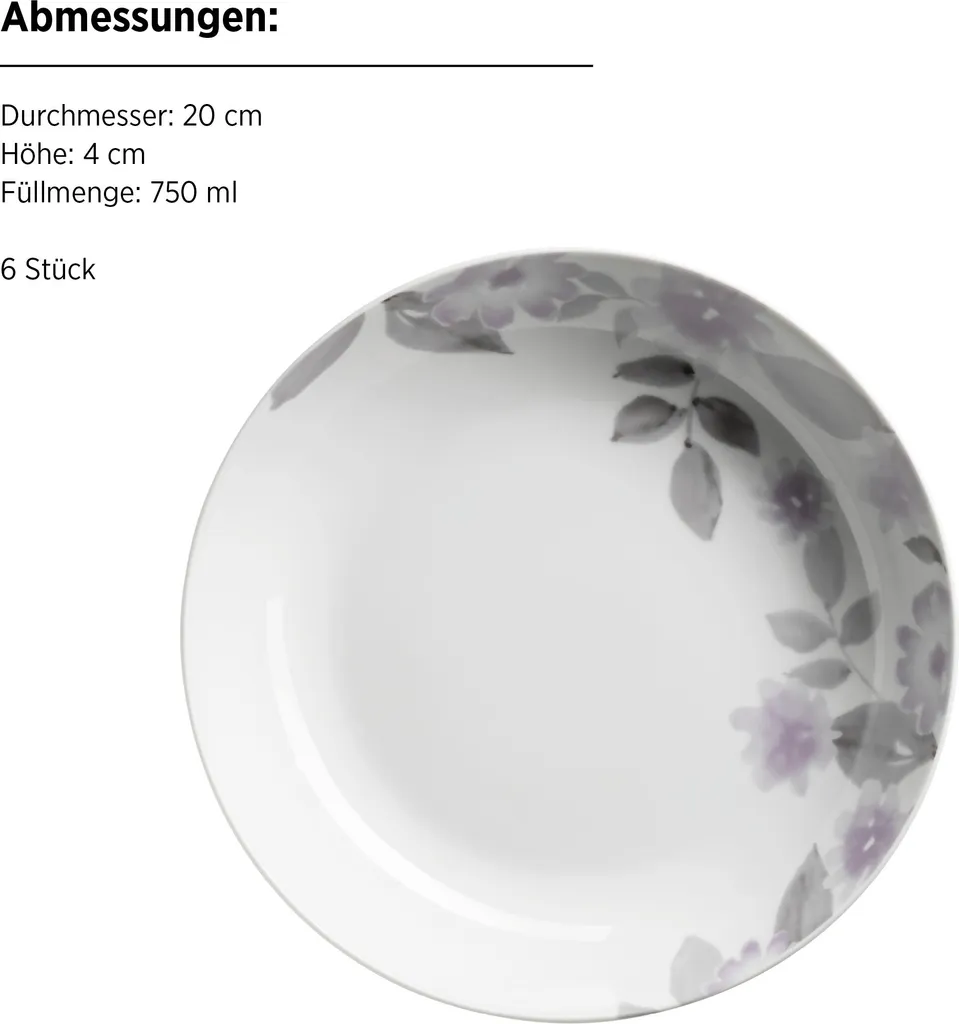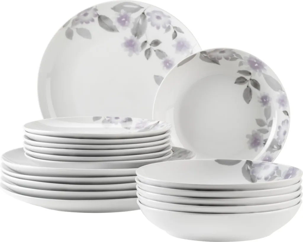 Подарите своему столу свежее цветочное волшебство с набором посуды MÄSER "Sono" из 18 предметов. Этот стильный набор на шесть персон включает шесть обеденных, шесть суповых и шесть десертных тарелок. Современный цветочный дизайн в сиреневых и серых тонах на элегантном белом фарфоре одновременно романтичен и современен. Изготовленный из высококачественного фарфора, набор не только впечатляет внешним видом, но и впечатляет своей прочностью и практичностью в повседневной жизни. Этот набор посуды можно мыть в посудомоечной машине и использовать в микроволновой печи, он удобен в использовании каждый день. Будь то непринужденный завтрак, праздничный ужин или главное украшение стола для особых случаев, набор посуды MÄSER Sono сочетает в себе функциональность, качество и элегантный дизайн. Настоящий маст-хэв для тех, кто ценит стильную сервировку стола.