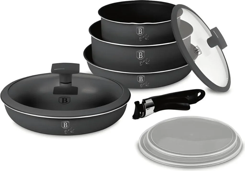 Набор алюминиевых кастрюль и сковородок высочайшего качества с тройным титановым покрытием TYTAN PRO и съемной ручкой с системой Click it. Изделие известного бренда BERLINGER HAUS из коллекции Antracite. Подходит для всех видов плит, включая индукционные. Кастрюли и сковородки имеют удобные съемные ручки с защитой от нагревания. Благодаря этому их удобно хранить, использовать в духовке и мыть в посудомоечной машине по сравнению с обычными моделями. Дно посуды имеет точно отшлифованное плоское основание с ферромагнитным диском. Это обеспечивает равномерный прогрев пищи и превосходное сохранение тепла. Съемная ручка облегчает хранение посуды. Пластиковые крышки, входящие в комплект, позволяют плотно закрывать посуду при хранении продуктов в холодильнике.