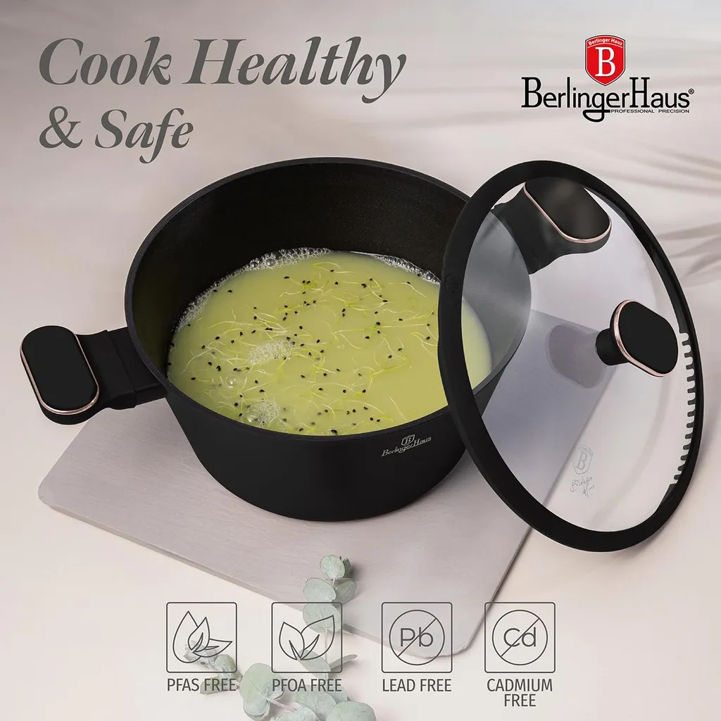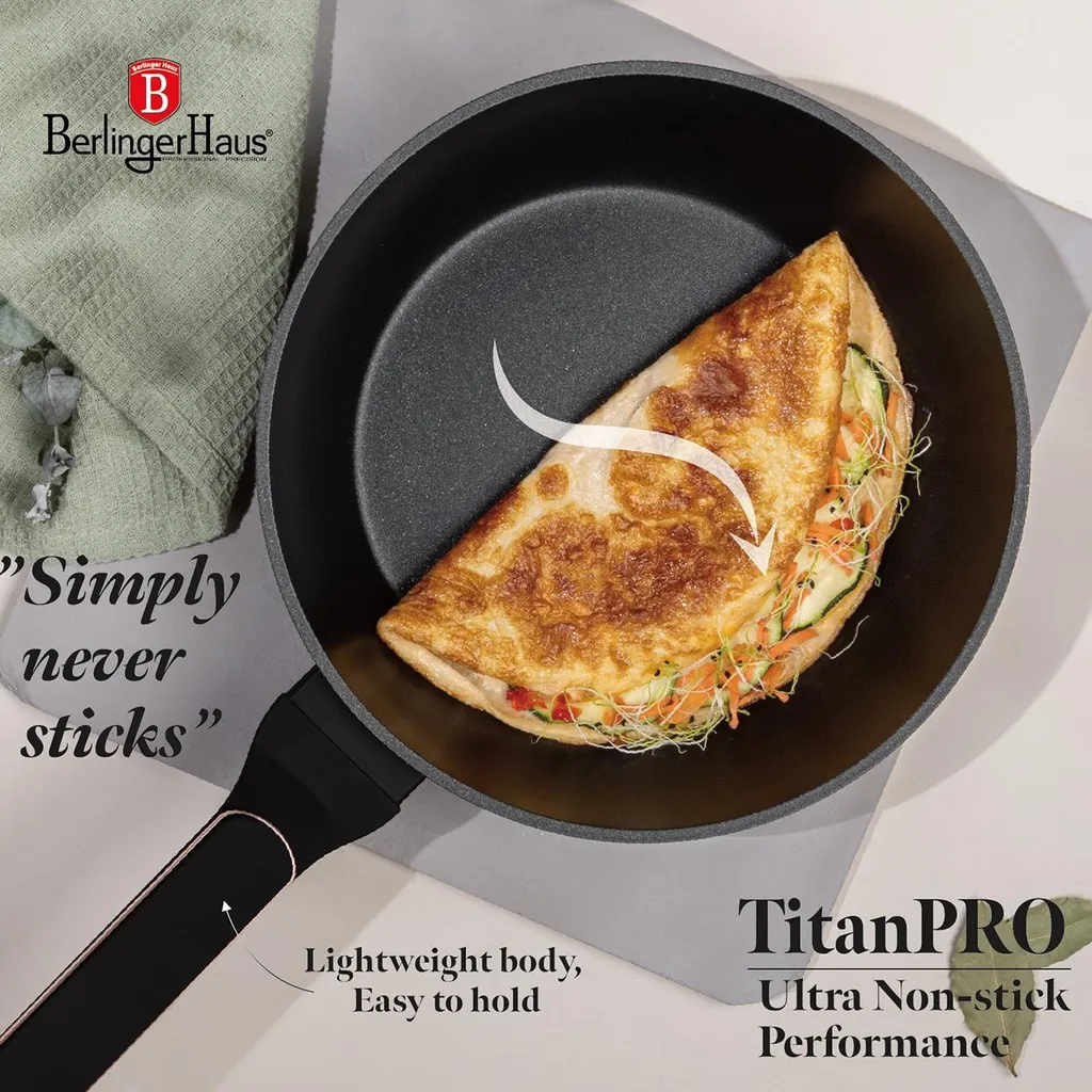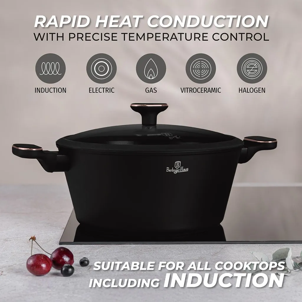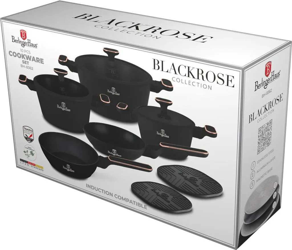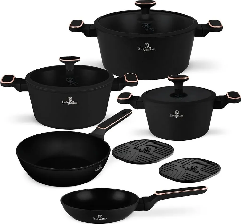 Berlinger Haus BH8362 Black Rose - набор посуды из 10 предметов с тройным антипригарным покрытием TitanPro, индукционными днищами Turbo и элегантным матово-черным дизайном с акцентами из розового золота.