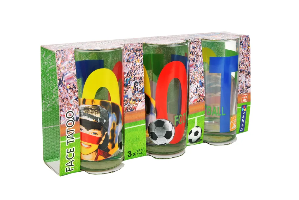 Высококачественный набор стаканов от Luminarc - настоящая приманка для футбольных болельщиков, когда они собираются вместе, ведь его веселый дизайн заставляет футбольные сердца сиять. Организаторы мероприятий и рестораторы оценят эти стаканы в наборах различной стоимости, включающих до 120 стаканов.