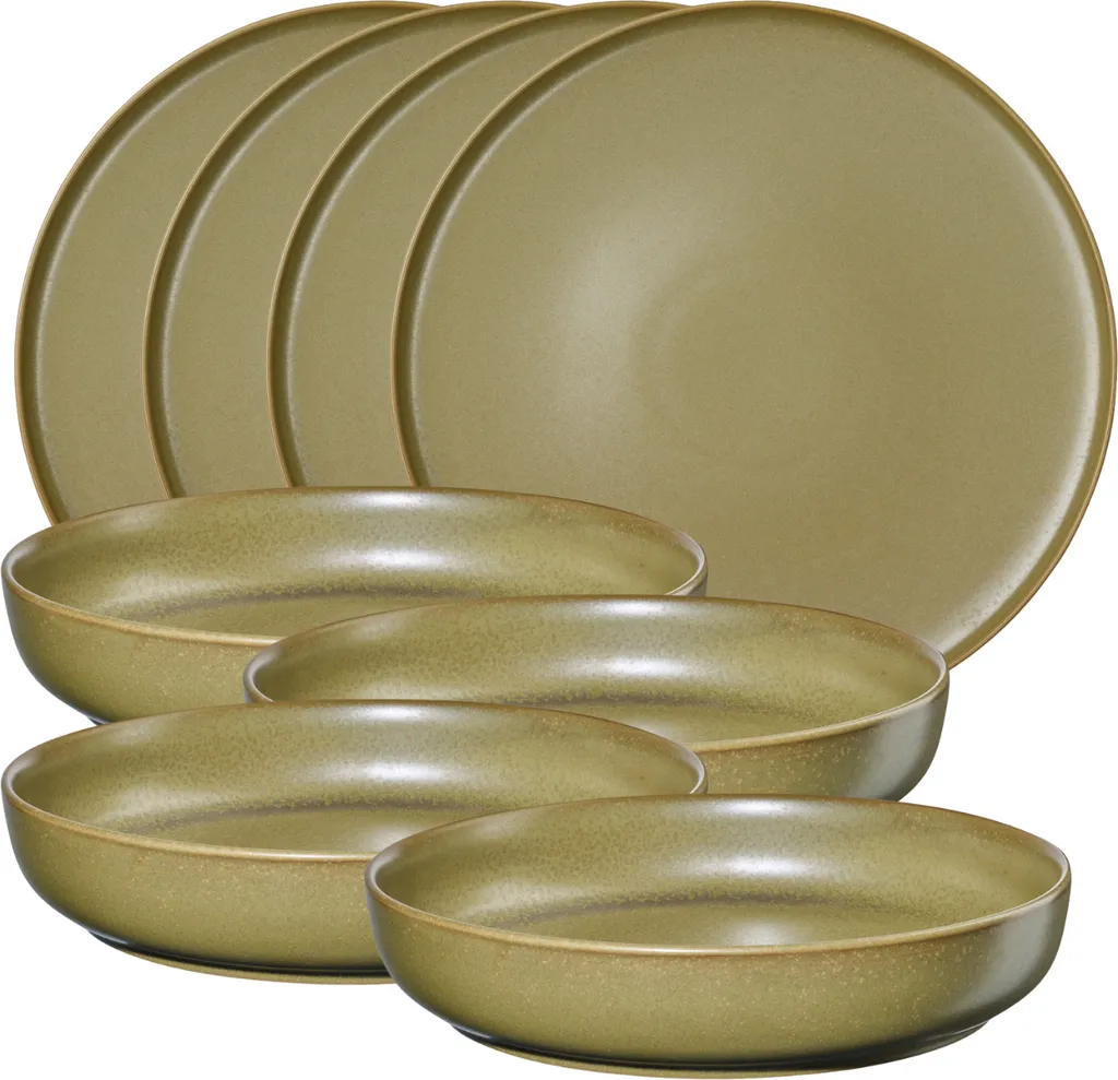 Набор посуды ASA Selection COPPA теплого оттенка Мисо сочетает в себе современный дизайн и естественную элегантность, создавая стильную сервировку стола. Этот набор из 8 предметов идеально подходит для четырех человек и состоит из четырех обеденных тарелок диаметром 26,5 см и четырех тарелок для пасты диаметром 21 см. Землисто-коричневый оттенок Мисо с матовой глазурью придает набору теплый и гармоничный вид. Минималистичный дизайн и высокое качество изготовления делают его стильным украшением, идеально вписывающимся в любую сервировку. Изготовленный из высококачественного фарфора, набор впечатляет своей прочностью и долговечностью. Все предметы можно мыть в посудомоечной машине и использовать в микроволновой печи, что делает их особенно простыми в уходе и подходящими для повседневного использования. Набор посуды ASA Selection COPPA Мисо сочетает в себе функциональность и стильный дизайн, идеально дополняя любую коллекцию посуды. Так называемые реактивные глазури придают изделиям великолепный внешний вид благодаря уникальным цветовым переходам, фактуре и другим особенностям, которые ни в коем случае не являются дефектом, а, напротив, делают каждое изделие уникальным. Разнообразные эффекты делают каждое изделие по-настоящему индивидуальным. Цветовые переходы, крапинки, точки, мелкие пузырьки и даже неровности не являются основанием для рекламации, а, напротив, специально предусмотрены производителем и придают вашей новой посуде индивидуальный характер. Фарфор, можно мыть в посудомоечной машине и использовать в микроволновой печи. В набор входят: 4 обеденные тарелки (26,5 см), 4 изысканные тарелки (21 см).