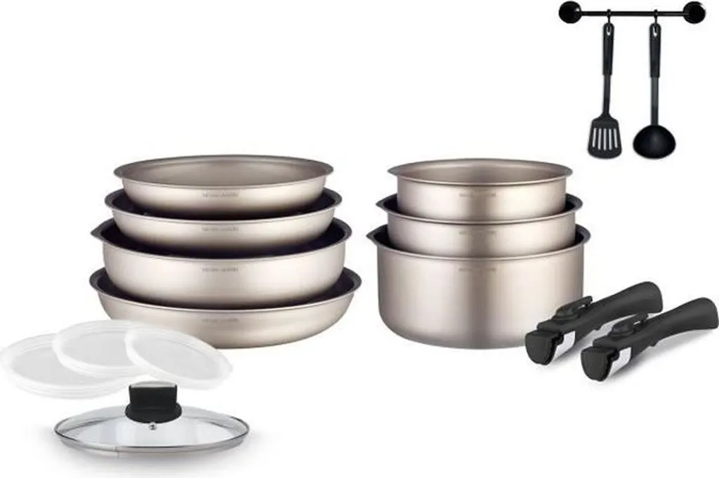 Комплект поставки: 3 сковороды 20-24-28 см - 3 кастрюли 16-18-20 см - сотейник 24 см - стеклянная крышка 24 см - 3 герметичные крышки 16-18-20 см - 2 столовые приборы - 2 съемные ручки