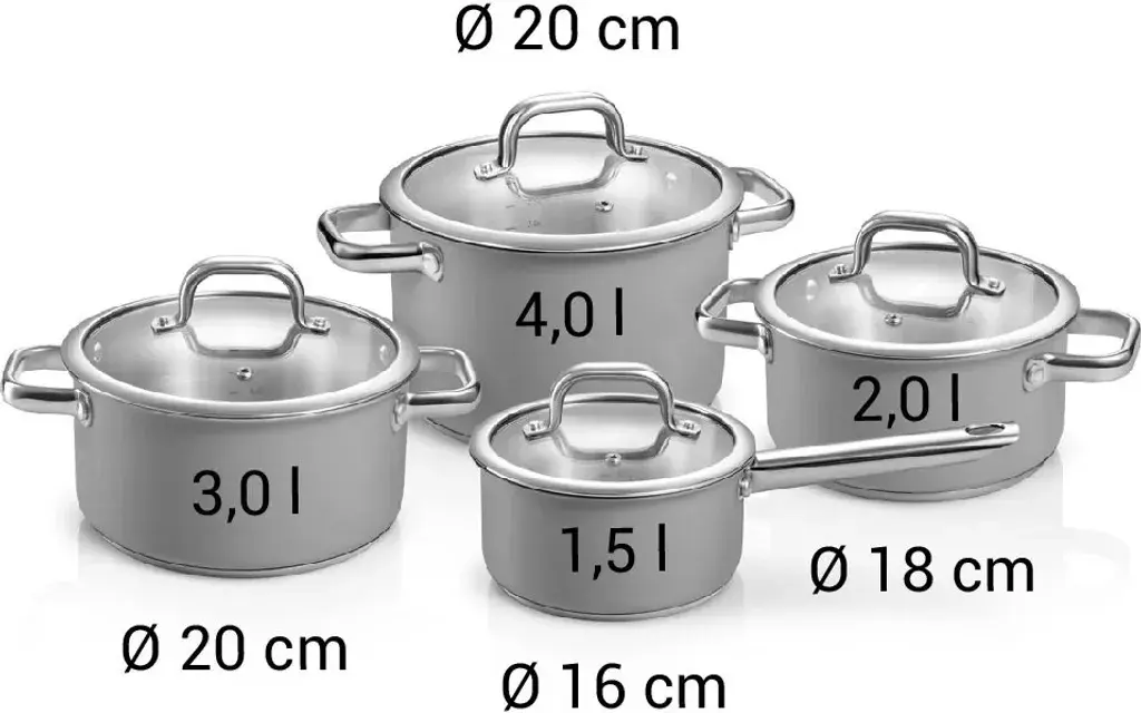 Набор индукционной посуды из нержавеющей стали с прочной поверхностью. Что отличает набор посуды DELIGHT Taupe? Набор посуды DELIGHT отличается прочной поверхностью привлекательного серо-коричневого цвета taupe. Набор посуды DELIGHT Taupe из восьми предметов из нержавеющей стали включает: 2 кастрюли DELIGHT Taupe с крышками ¤ 20 см, 4,0 л; 2 кастрюли DELIGHT Taupe с крышками ¤ 18 см, 2,0 л; 2 кастрюли DELIGHT Taupe с крышками ¤ 20 см, 3,0 л; 2 кастрюли Delight Taupe с крышками ¤ 16 см, 1,5 л. Посуда DELIGHT Taupe имеет прочную крышку из стекла и нержавеющей стали с отверстием для выхода пара, просторные удобные ручки, индукционное дно и мерную шкалу. Благодаря прочному внешнему покрытию кастрюли и сотейники легко содержать в чистоте. Для чистки внешней поверхности не требуются специальные средства.