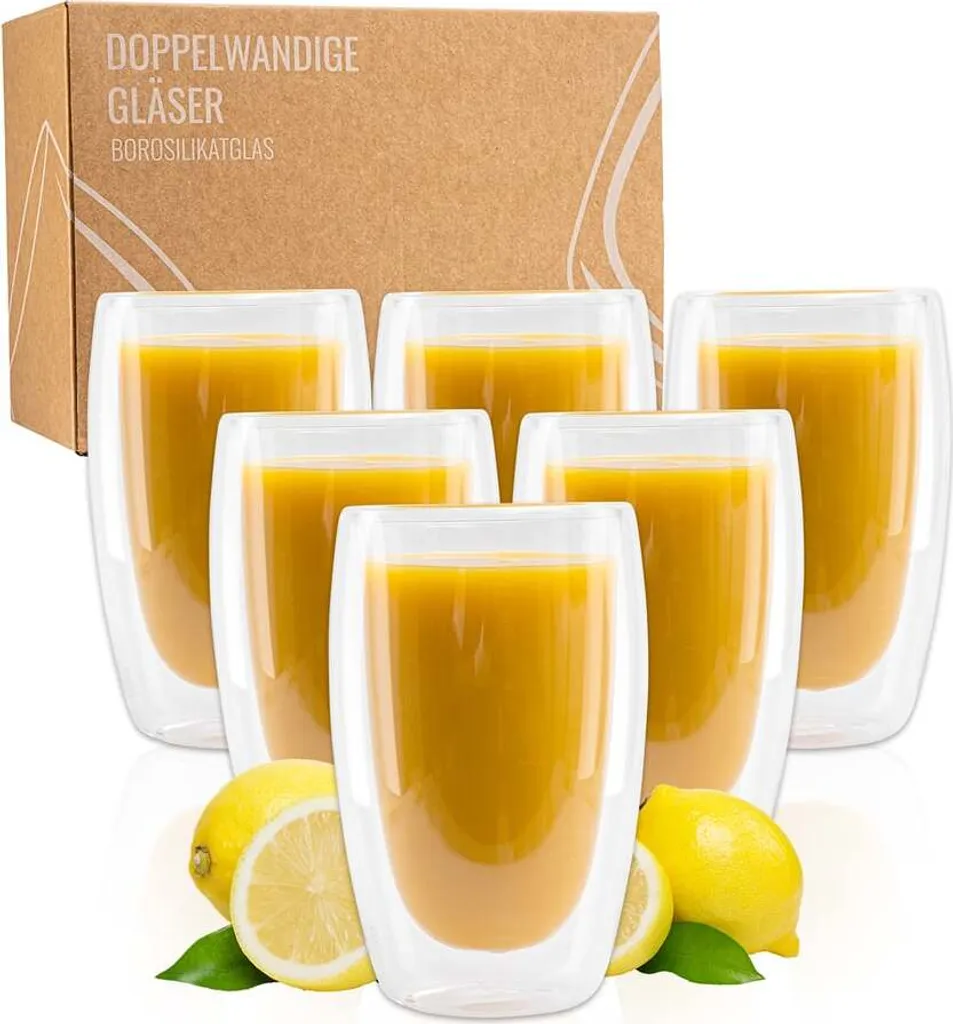 ПРАКТИЧЕСКИЙ НАБОР ИЗ 6 ПРЕДМЕТОВ: Двойные стаканы емкостью 450 мл каждый - идеально подходят для латте маккиато, горячего шоколада и т. д. ПРОЗРАЧНЫЙ И СОВРЕМЕННЫЙ ДИЗАЙН: Изготовлены из толстого и особо прочного боросиликатного стекла - бесшовные и прозрачные. ДЛЯ ГОРЯЧИХ НАПИТКОВ: Для кофе, горячего шоколада, латте маккиато, капучино, чая и т. д. - также идеально подходят для безалкогольных напитков. ДВОЙНАЯ ИЗОЛЯЦИЯ: Сохраняет горячие напитки горячими дольше, а холодные напитки приятными и прохладными - идеальная температура питья и удобное использование. УНИВЕРСАЛЬНЫЙ И ЛЕГКИЙ: Можно мыть в посудомоечной машине и использовать в микроволновой печи - также для подогрева кофе и холодных безалкогольных напитков и пива. Наслаждайтесь напитком стильно! Будь то латте маккиато, кофе, безалкогольные напитки, пиво, чай или горячий шоколад: стаканы для латте маккиато EXITOSO с двойными стенками в наборе из шести сохранят ваш любимый напиток приятным и теплым или освежающе холодным! Эти стаканы объемом 450 мл сочетают в себе элегантный дизайн и практичность, предлагая много места для вашего любимого напитка. Благодаря прочной конструкции из боросиликатного стекла стаканы не только исключительно прочные, но и легкие. Двойные стенки термоизоляции гарантируют, что горячие напитки дольше остаются теплыми, а холодные напитки сохраняют идеальную температуру - без раздражающего конденсата и с особенно приятным ощущением! Прозрачный, бесшовный дизайн идеально впишется в любую современную кухню. Эти универсальные стаканы подойдут для любого случая, их также можно мыть в посудомоечной машине и использовать в микроволновой печи, так что вы можете легко мыть их и даже использовать для подогрева напитков. Поднимите свои моменты на новый уровень наслаждения: стаканы EXITOSO с двойными стенками для латте макиато - в удобном наборе из шести штук. Идеальные спутники на каждый день!