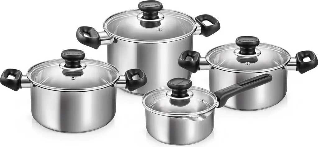 Современная посуда из нержавеющей стали. Что отличает набор посуды BRAVA из 8 предметов? Кастрюли изготовлены из высококачественной нержавеющей стали, что делает набор BRAVA идеальным кухонным инструментом для ежедневного приготовления пищи. Он имеет сверхтолстое многослойное дно, подходящее для всех плит, включая индукционные. Эргономичные ручки из прочного пластика удобны и безопасны, не обжигая руки во время приготовления. Прочные закругленные крышки из нержавеющей стали оснащены отверстием для выхода пара. Набор посуды BRAVA состоит из 8 предметов (по 2 каждого): кастрюля BRAVA с крышкой, 20 см, 4,0 л; кастрюля BRAVA с крышкой, 18 см, 2,0 л; кастрюля BRAVA с крышкой, 20 см, 3,0 л; кастрюля BRAVA с двухсторонней воронкой и крышкой, 16 см, 1,25 л.