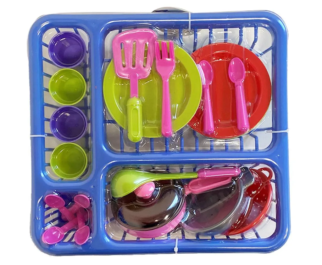 Подарите своим детям красивую, яркую кухонную утварь, и кулинарная игра станет еще увлекательнее. Пластиковый кухонный набор включает в себя поддон для сушки, чашки, тарелки, столовые приборы и кухонную утварь. > Размеры упаковки: примерно 28,5 x 30 x 7 см. Рекомендуемый возраст: от 3 лет.