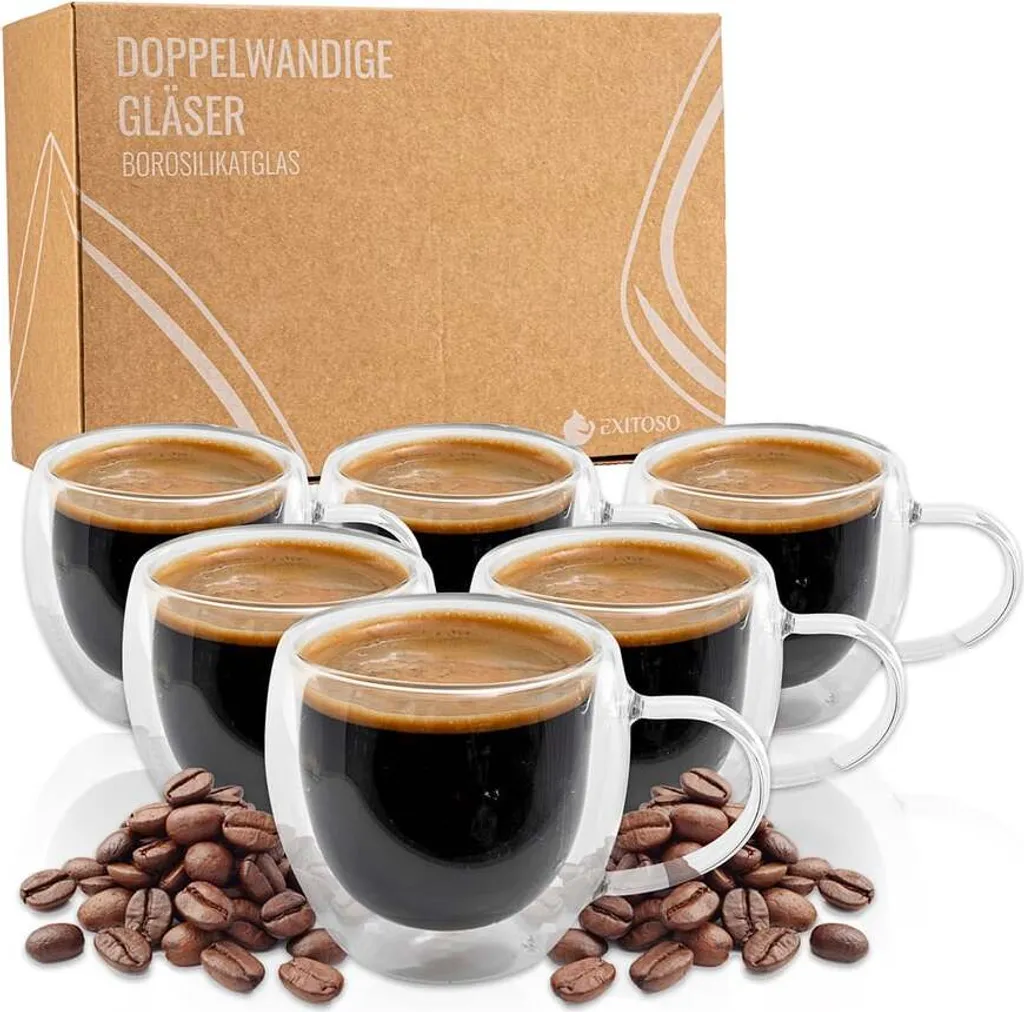 ПРАКТИЧЕСКИЙ НАБОР ИЗ 6 ПРЕДМЕТОВ: Стаканы с двойными стенками с ручками и емкостью 80 мл каждый - для эспрессо, безалкогольных напитков и т. д. ПРОЗРАЧНЫЙ И СОВРЕМЕННЫЙ ДИЗАЙН: Изготовлены из толстого и особо прочного боросиликатного стекла - бесшовные и прозрачные. ДЛЯ ГОРЯЧИХ НАПИТКОВ: Для эспрессо, капучино, чая и многого другого - также идеально подходят для многих различных безалкогольных напитков. ДВОЙНАЯ ИЗОЛЯЦИЯ: Сохраняет горячие напитки горячими дольше, а холодные напитки приятными и прохладными - идеальная температура питья и удобное использование. УНИВЕРСАЛЬНЫЙ И ЛЕГКИЙ: Можно мыть в посудомоечной машине и использовать в микроволновой печи - также для подогрева кофе и холодных безалкогольных напитков и пива. Испытайте идеальное наслаждение с набором из 6 предметов стаканов с двойными стенками (80 мл) от EXITOSO. Поскольку эти стаканы тщательно изготовлены из высококачественного боросиликатного стекла, они впечатляют своей легкостью, прочностью и особенно элегантной формой. Бесшовная конструкция обеспечивает исключительно чистый дизайн. Благодаря практичной ручке стаканы удобно лежат в руке - идеально для стильного наслаждения эспрессо! Горячие или холодные: ваши любимые напитки теперь без труда сохранят идеальную температуру надолго. Инновационная двойная изоляция стенок сохраняет кофе или чай приятно теплыми, а холодные напитки - освежающе прохладными. Кроме того, изоляция предотвращает образование конденсата, поэтому у вас всегда будет сухой и надежный захват. И самое лучшее? Стаканы можно мыть в посудомоечной машине и использовать в микроволновой печи - для максимального удобства каждый день. Универсальность сочетается с долговечностью: эти стаканы не просто привлекают внимание. Будь то чашки для эспрессо, капучино или латте макиато - они подстраиваются под ваш момент наслаждения. Благодаря легкому дизайну стаканы станут идеальным спутником на каждый день, не жертвуя при этом прочностью. Побалуйте себя стильным наслаждением кофе и наполните свою кухню вневременной элегантностью с набором из 6 стаканов с двойными стенками (80 мл) от EXITOSO.