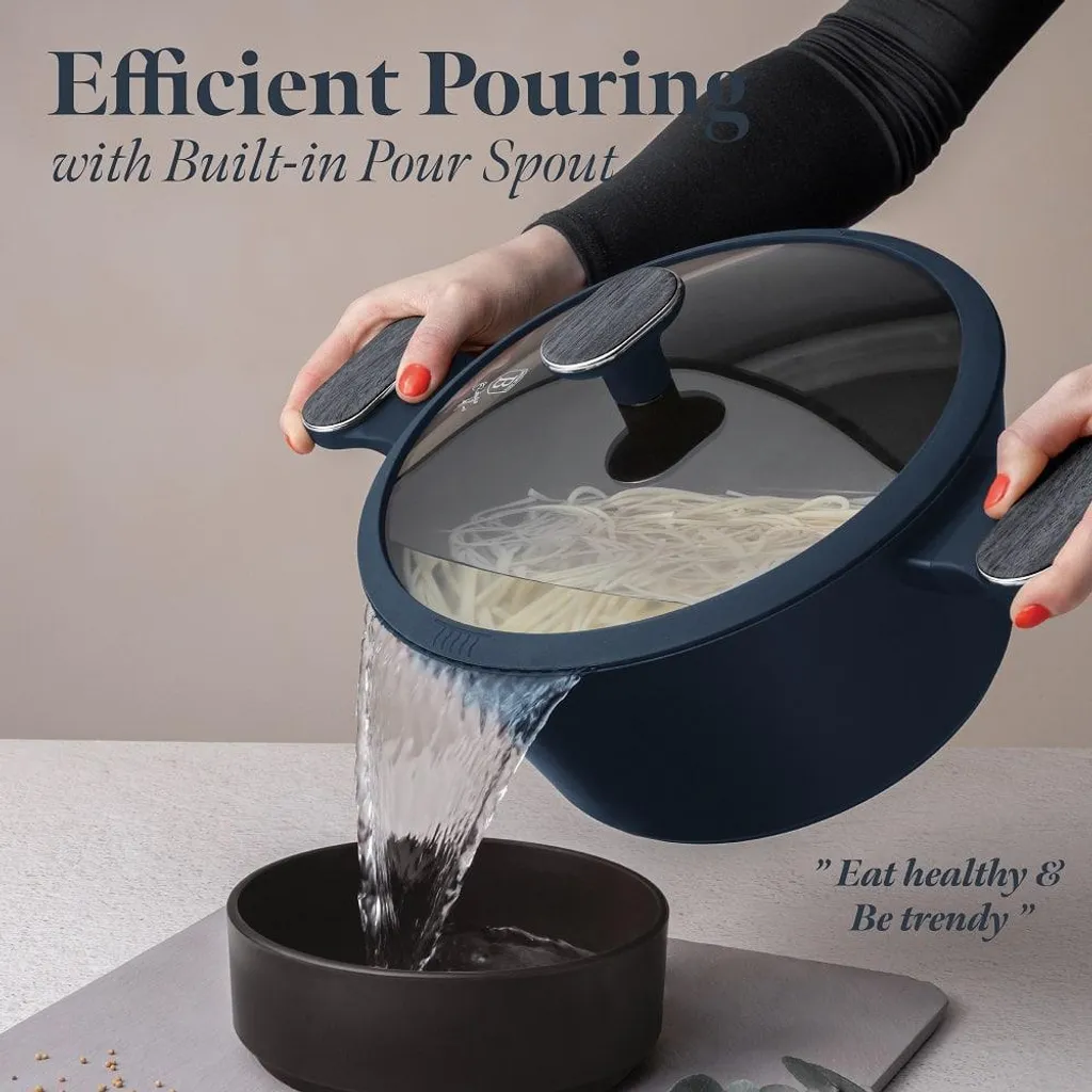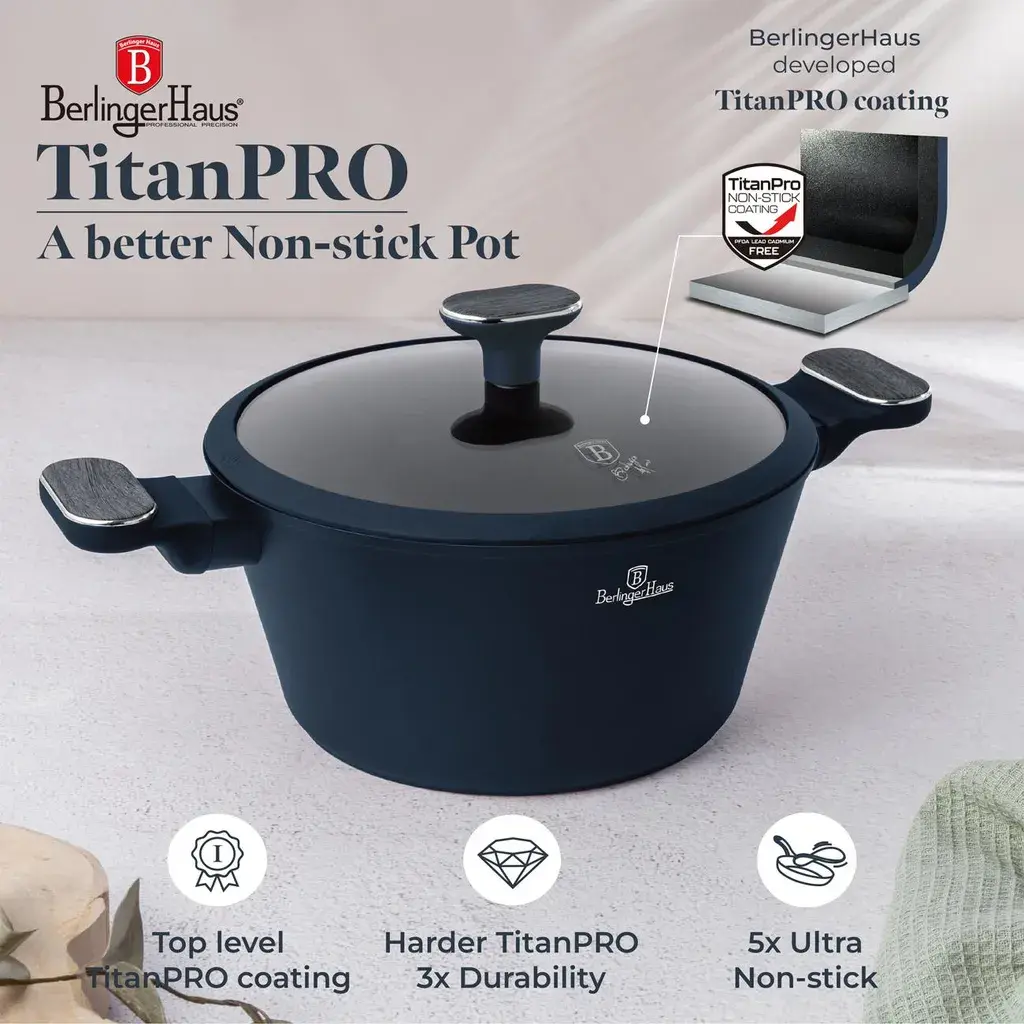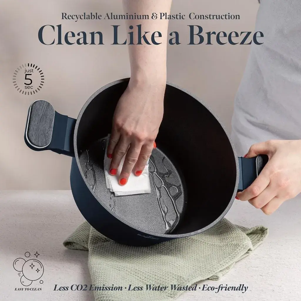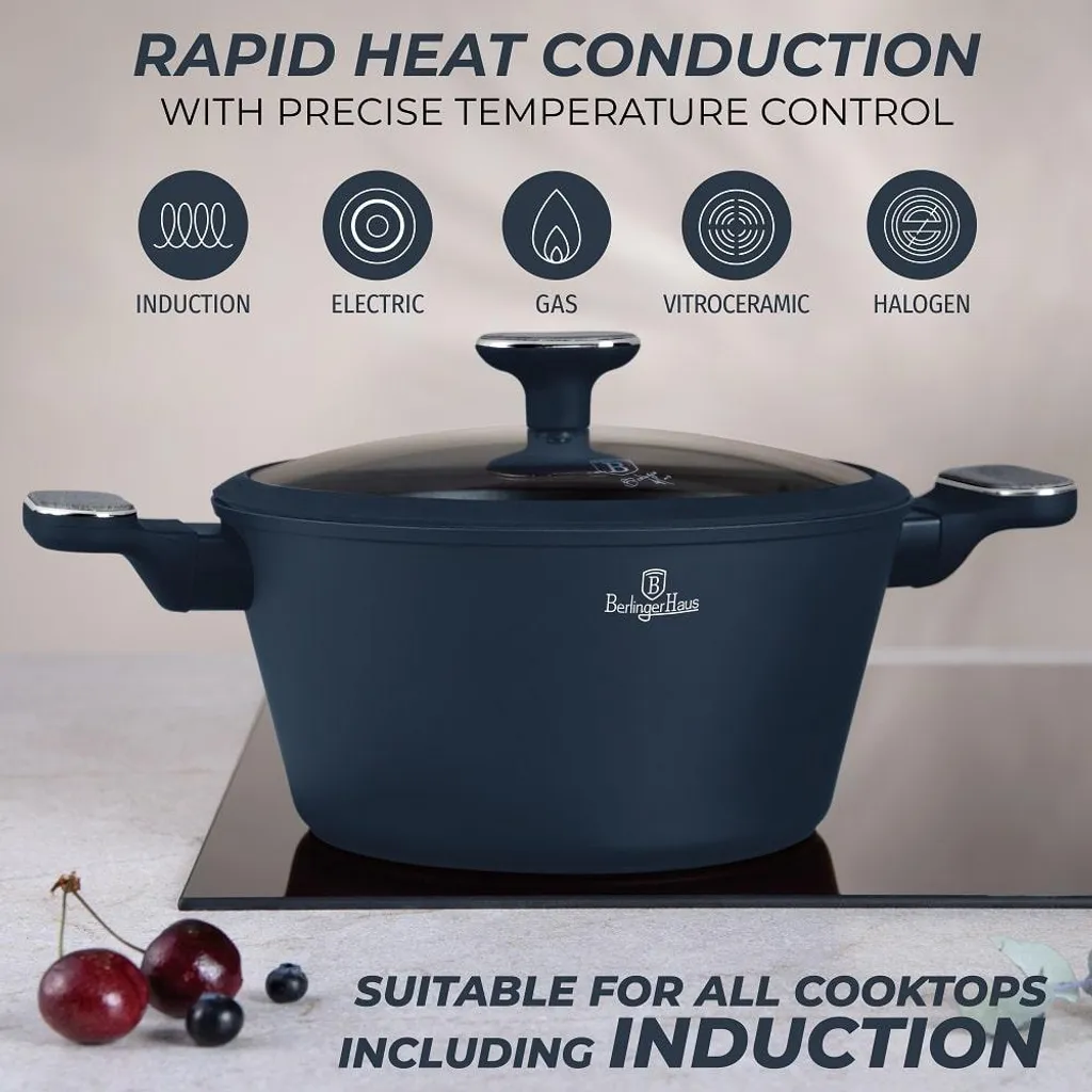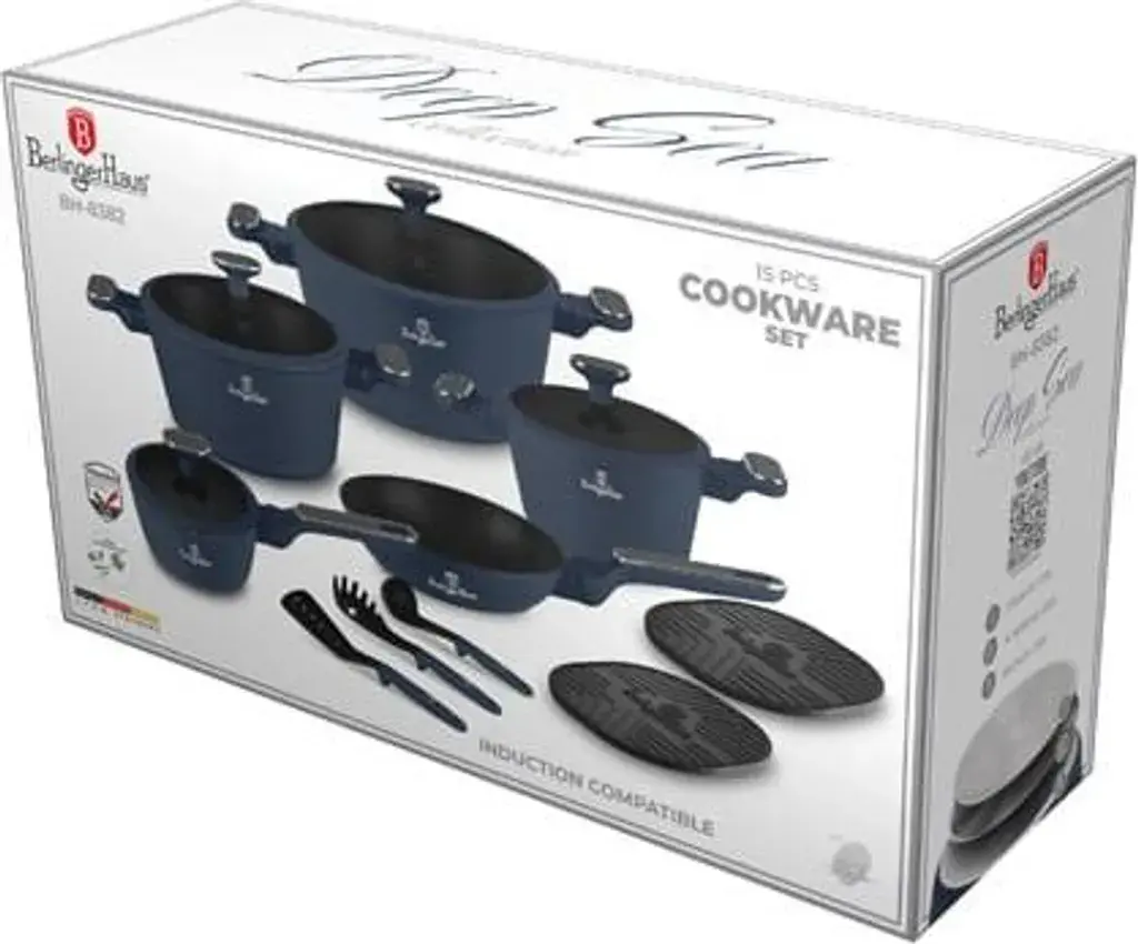 Тип: Смешанный набор В комплекте форма для запекания: Да Сковорода(ы): Да Соусник(и): Да Цвет продукта: Синий Материал: Алюминий Внутреннее покрытие: Titan Pro Тефлоновое покрытие: Да Цвет ручки: Серый, серебристый Крышка в комплекте: Да Материал крышки: Стекло Количество крышек В комплекте: 4 Ручка Cool Touch: Да Характеристики ручки: Эргономичная, Soft Touch Подходит для следующих варочных панелей: Керамическая, Электрическая, Газовая, Галогенная, Индукционная Емкость кастрюли: 1,2 л Диаметр кастрюли: 16 см Диаметр сковороды: 24 см Диаметр сковороды 2: 28 см Диаметр формы для запекания: 20 см Диаметр формы для запекания 2: 24 см Диаметр формы для запекания 3: 28 см Емкость формы для запекания 3: 6,3 л Емкость формы для запекания: 2,6 л Емкость формы для запекания 2: 4,3 л Количество продуктов в комплекте: 15 шт. Количество кастрюль: 1 шт. Количество сковородок: 2 шт. Половник в комплекте: Да Откройте для себя кулинарное мастерство с набором посуды из 15 предметов из коллекции Deep Sea от Berlinger Haus. Изготовленный из кованого алюминия с тройным антипригарным покрытием TitanPro, этот набор обеспечивает равномерное и легкое приготовление пищи. Он включает в себя различные сковороды и кастрюли с крышками-дуршлагами, подходящими для любого рецепта. Эргономичные ручки и ручки с мягкими накладками и посеребренными вставками обеспечивают комфорт и безопасность во время приготовления. Крышки из закаленного стекла с термостойкой системой плавного закрытия позволяют контролировать процесс приготовления, а матовая сине-серая отделка под дерево привнесет минималистичный и элегантный стиль в вашу кухню. Этот набор совместим со всеми варочными панелями, включая индукционные, и экологически безопасен, не содержит перфтороктановой кислоты (PFOA), свинца и кадмия. Он также легко моется, поэтому вы сможете дольше наслаждаться самым важным - своими кулинарными творениями. Выведите свои кулинарные шедевры на новый уровень с этим универсальным и изысканным набором.