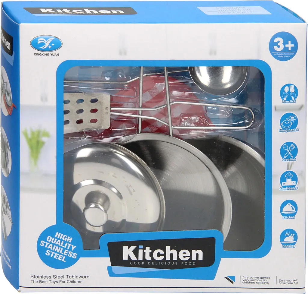 Этот набор посуды из 6 предметов включает в себя две металлические миски, крышку, две сервировочные ложки и хлопковую прихватку. Прекрасное дополнение к вашей игрушечной кухне!