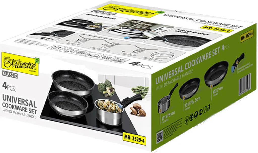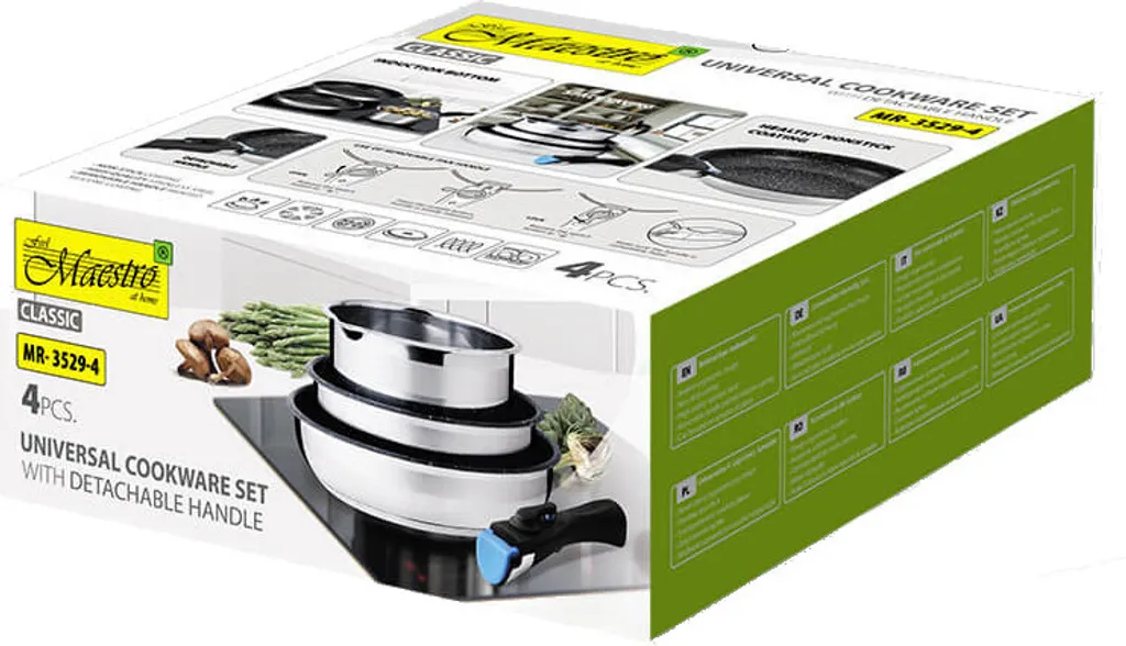 Технические характеристики: - Кастрюля: Ø 18 см x 8 см - Сковорода: Ø 22 см x 5 см - Фритюрница: Ø 24 см x 6,5 см - Съемная ручка - Внутреннее покрытие: Антипригарное покрытие - Можно мыть в посудомоечной машине - Подходит для всех типов варочных панелей - Набор из 4 предметов, 2 сковороды + кастрюля со съемной ручкой, Maestro MR-3529-4 - Идеальное дополнение к вашей кухне - Набор состоит из 2 сковород и кастрюли - Съемная ручка - Прочное антипригарное покрытие - Изготовлена из высококачественной нержавеющей стали Бренд: Feel Maestro Цвет: Разноцветный Размеры: 26 x 11,1 x 26 сантиметров Особенности: Подходит для типов варочных панелей: Газовая, Электрическая, Керамическая, Индукционная, Галогенная Съемная ручка: Да Можно мыть в посудомоечной машине: Да Цвет изделия: Черный, Серебристый Материал: Нержавеющая сталь Вес и размеры: Диаметр кастрюли: 18 см Жарка Диаметр сковороды: 24 см Диаметр сковороды 2: 22 см Содержимое упаковки: Количество кастрюль: 1 В комплекте ручки: 1 шт.