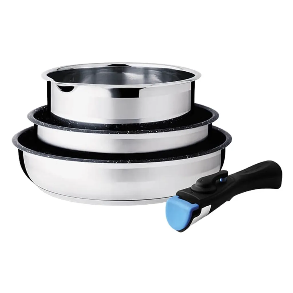 Этот современный набор из сковороды и кастрюли, состоящий из 4 предметов, идеально подходит для любой кухни, особенно небольшой. В него входят кастрюля диаметром 18 см и высотой 8 см, а также две сковороды диаметром 22 см и высотой 5 см, а также диаметром 24 см и высотой 6,5 см. Практичная съемная ручка делает посуду удобной в использовании.