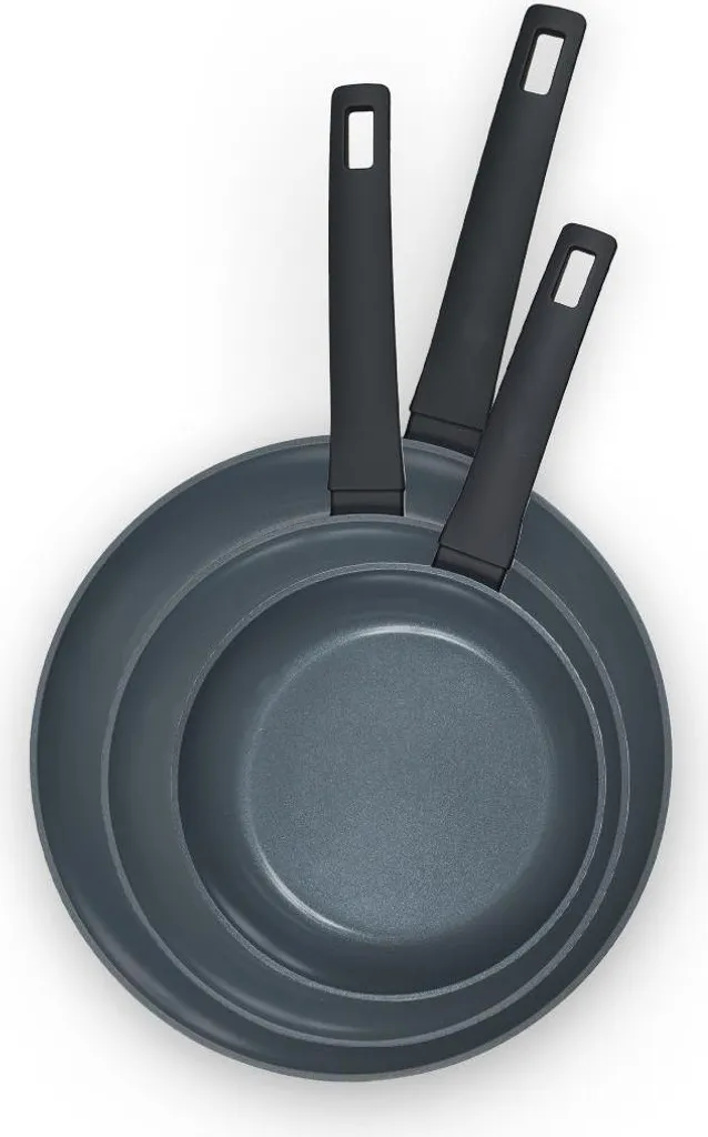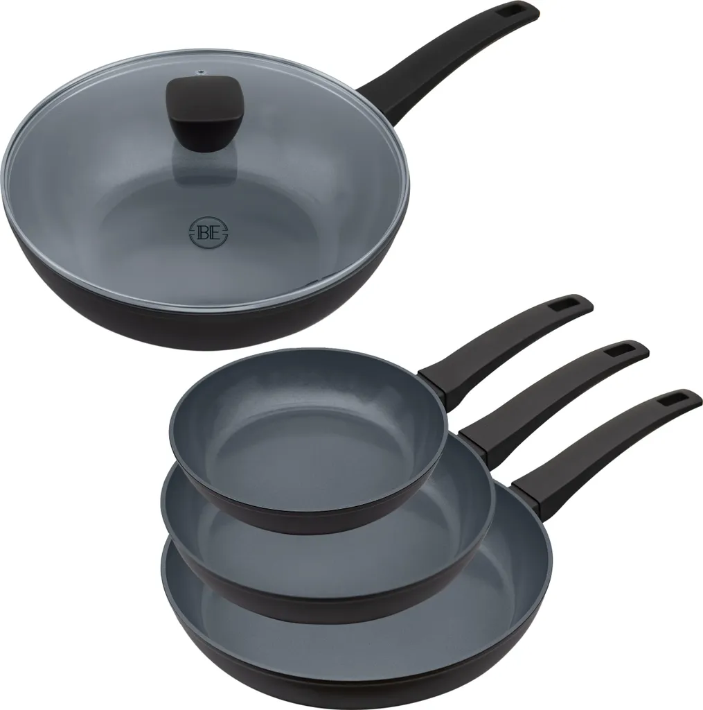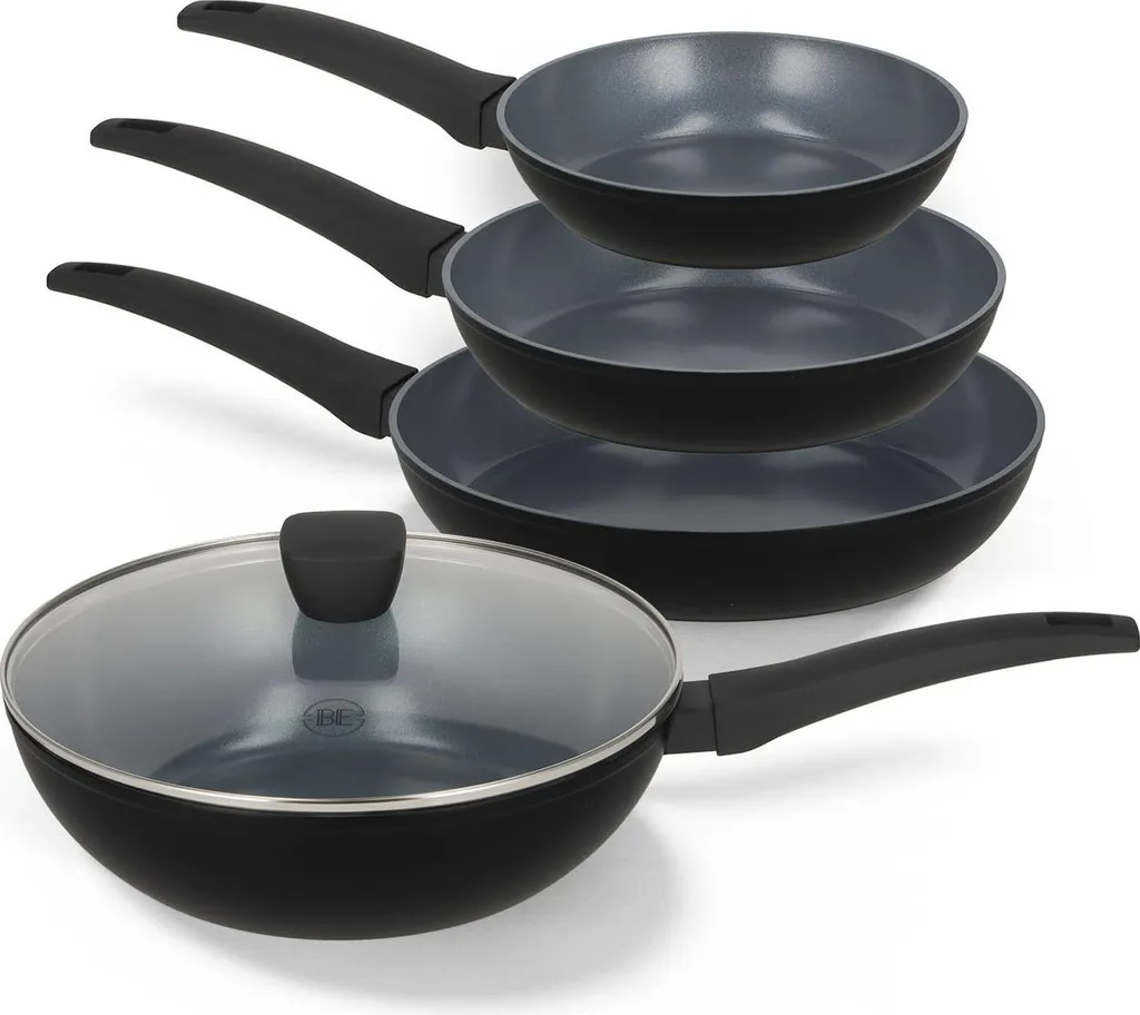 BE Living представляет практичный набор сковородок, состоящий из сковород диаметром 20 см, 24 см и 28 см, а также вока диаметром 28 см с крышкой в элегантном черном цвете. Подходит для всех источников нагрева, включая индукционные, и не содержит перфторированных жирных кислот (PFAS). Незаменимая вещь для каждого любителя готовить!