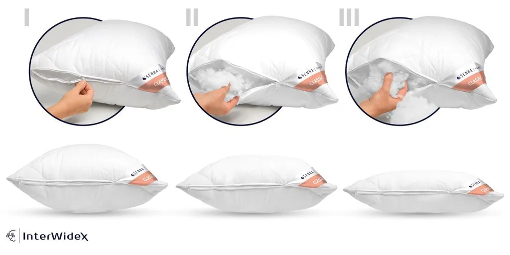 Подушка оснащена вшитой застежкой-молнией. Это практичное дополнение, которое обеспечивает легкий доступ к внутренней части подушки, позволяя контролировать ее высоту и мягкость. Это простое решение позволяет каждому пользователю наслаждаться идеально подобранным комфортом, независимо от меняющихся потребностей или времени года.