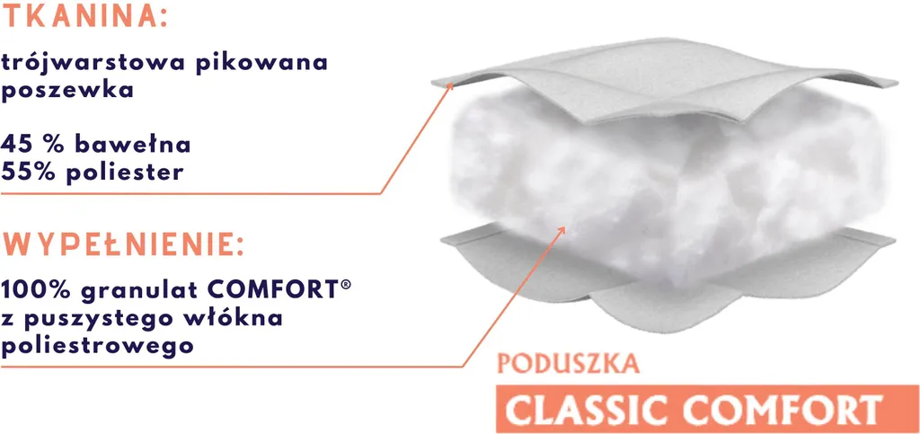 Чехол подушки CLASSIC состоит из смеси хлопка и полиэстера, наполнителя из полиэстера и нетканого материала. Эти материалы в сочетании со стежкой обеспечивают мягкость и нежно обволакивают голову и шею спящего. Это делает подушку очень удобной, сохраняя при этом ее дышащие свойства. Ткань мягкая, приятная на ощупь и не скатывается. НАПОЛНИТЕЛЬ: 100% гранулы COMFORT из пушистого полиэфирного волокна. Подушка COMFORT наполнена тысячами мягких и легких гранул пушистого полиэфирного волокна, которые адаптируются к форме головы и шеи, обеспечивая лучшую поддержку. ПАРАМЕТРЫ: Тип подушки: классическая подушка для сна со стеганым трехслойным чехлом. Размер подушки: 50x70 см. см