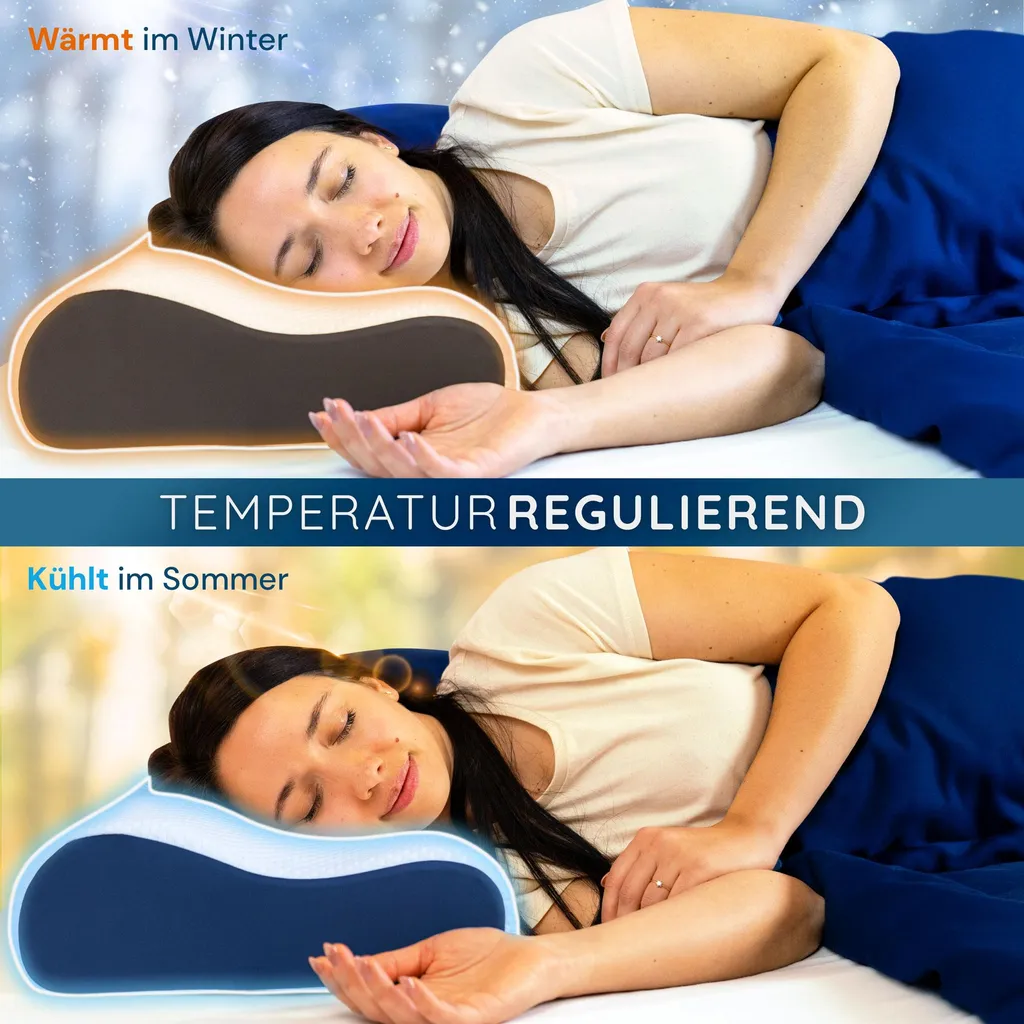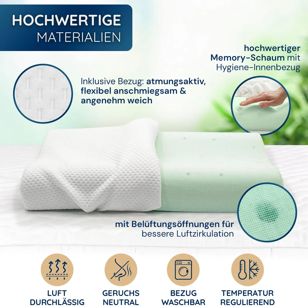 Наполнитель из высококачественной пены с эффектом памяти реагирует на тепло тела и адаптируется к форме головы. Это обеспечивает равномерное распределение давления и комфорт. Многочисленные вентиляционные отверстия способствуют циркуляции воздуха, обеспечивая свежий воздух во время сна даже при длительном использовании.