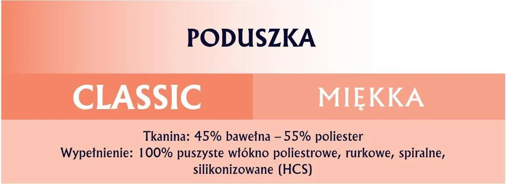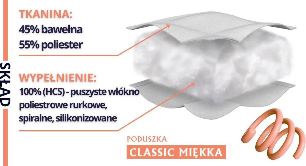 55% Полиэстерматериала. Это сочетание объединяет преимущества натурального хлопка с высокой прочностью и износостойкостью полиэстера. И полиэстер, и хлопок являются гипоаллергенными материалами, что делает их идеальным выбором для людей с чувствительной кожей или склонных к аллергии, а также для детей. МЯГКИЙ НАПОЛНИТЕЛЬ: 100 HCS - трубчатое спиральное силиконизированное полиэфирное волокно с 3D-системой. Подушка CLASSIC SOFT благодаря своему наполнителю удивительно пушистая и мягкая. 100% силиконизированное спиральное полиэфирное трубчатое волокно с 3D-системой обеспечивает оптимальную циркуляцию воздуха во время сна. Эта система также обеспечиваетэластичность и легкость
