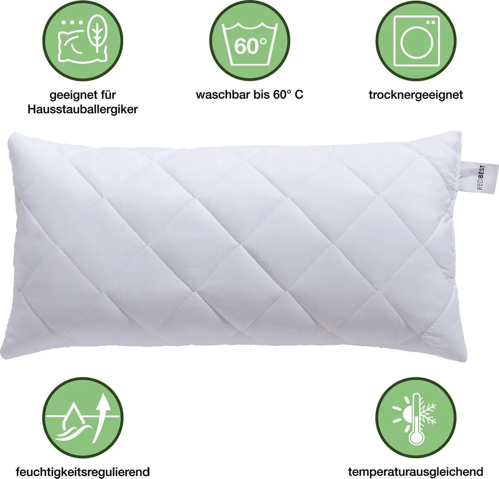 Подушка REDBEST Atlanta. Эта подушка поддерживает вас в правильном положении во время сна, предотвращая напряжение в плечах, спине и шее. Чехол из стеганой микрофибры, изготовленной из гладкой шелковистой ткани, идеально сочетается с мягким и эластичным наполнителем. Вы будете наслаждаться превосходным комфортом сна, оптимальным отведением влаги и прекрасным микроклиматом. Подушка проста в уходе, легко моется и гипоаллергенна. Наполнитель: силиконизированное полое волокно, 100% полиэстер. Чехол: микрофибра, 100% полиэстер. Характеристики продукта: - Подушка - Стеганая - Серия Atlanta - Жесткость подушки: мягкая - Однотонный дизайн - Качество: текстильное волокно - Можно стирать - Вакуумная упаковка, после стирки достигает полной высоты Открыть