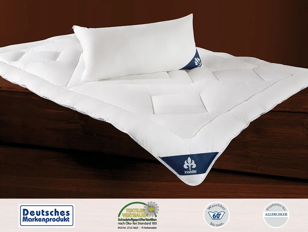 Одеяла и подушки Irisette Noblesse обеспечивают оптимальный и сухой климат для сна благодаря отличному отводу влаги. Они предлагают превосходное сочетание тепла, легкости и объема. Одеяла и подушки особенно просты в уходе и могут стираться при температуре до 60 °C. Поэтому они идеально подходят для людей с аллергией на пылевых клещей.