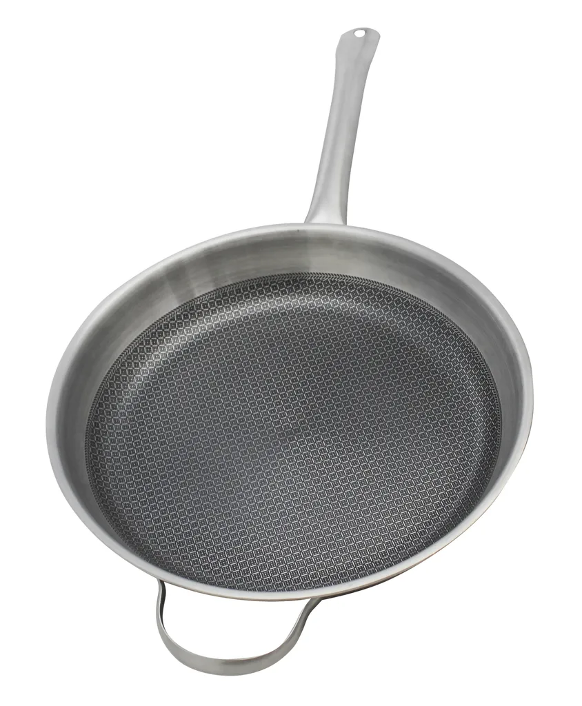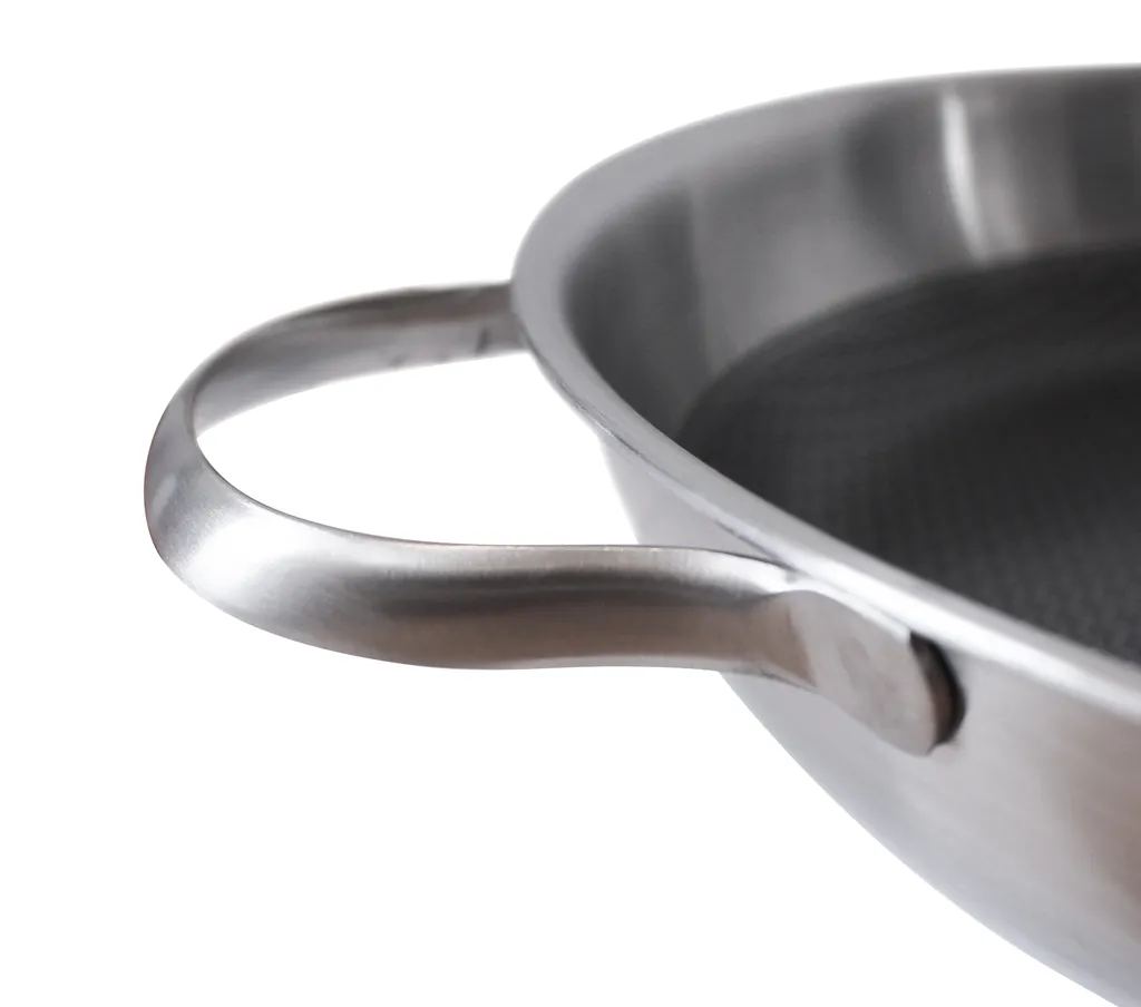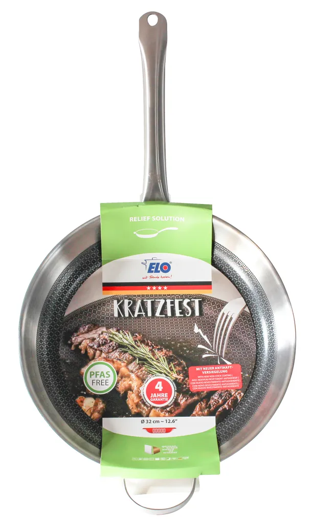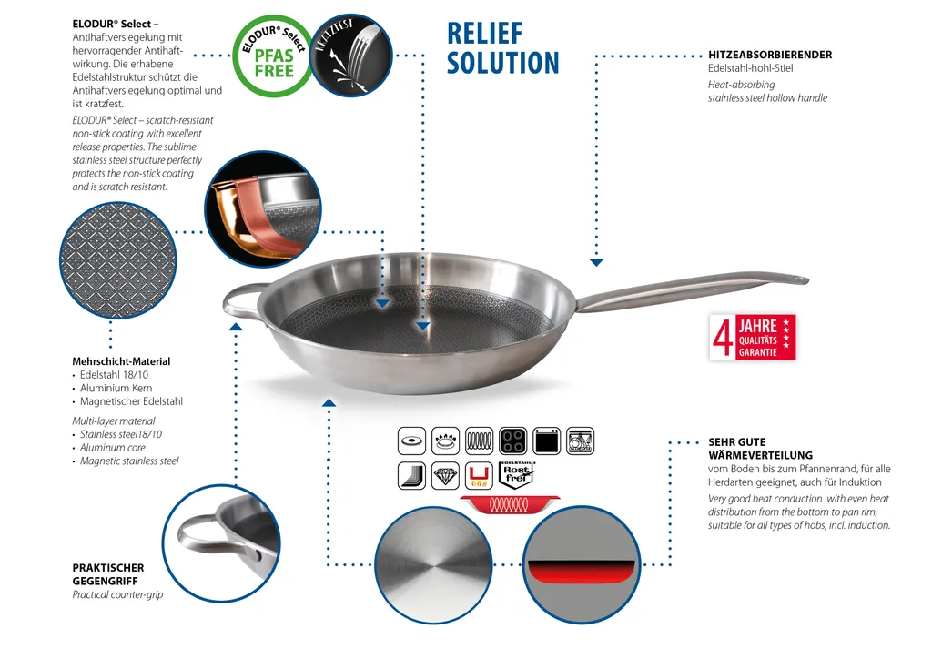 С сатинированной отделкой внутри и снаружи, Relief Solution впечатляет своей многослойной конструкцией: внутренняя часть выполнена из нержавеющей стали 18/10, сплошной алюминиевый сердечник и внешняя часть из магнитной нержавеющей стали обеспечивают равномерное распределение тепла от дна до края для идеальной жарки. Высококачественное антипригарное покрытие ELODUR Select устойчиво к царапинам, к нему ничего не пригорает, и его можно использовать в духовке при температуре до 240 °C. Специальный ободок предотвращает проливание, а полая ручка из нержавеющей стали удобно лежит в руке.