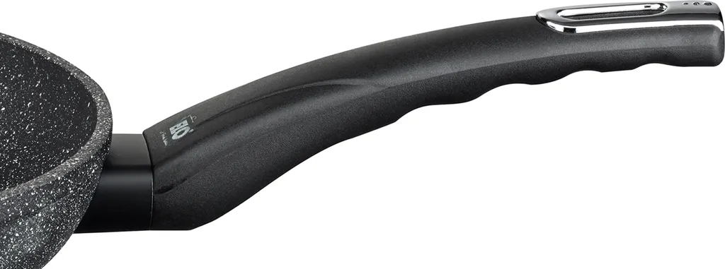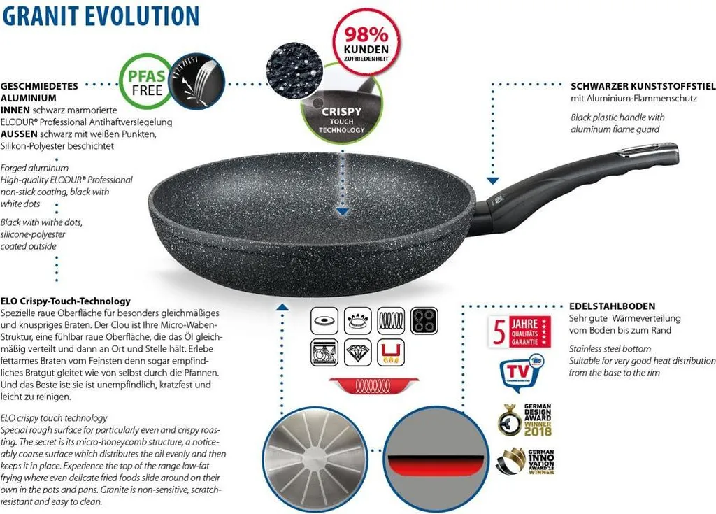 Сковорода ELO Ø 24 см Granite Evolution ELODUR Professional. Высококачественный кованый алюминий, толщина стенок: 2,9 мм, толщина дна: 5,1 мм. Высококачественное антипригарное покрытие ELODUR, устойчивое к царапинам. Специальная сверхшероховатая поверхность для получения исключительно хрустящей корочки. Внешняя поверхность с черным мраморным рисунком и белыми точками, силикон-полиэстеровое покрытие. Равномерное распределение тепла по всему периметру, экономящее время и электроэнергию. Черная пластиковая ручка с пламегасителем и вставками из нержавеющей стали. Подходит для всех видов плит, включая индукционные. Упаковка: Половина коробки из фотокартона.