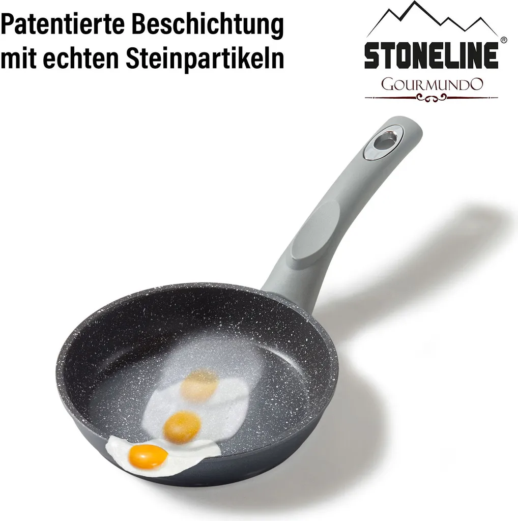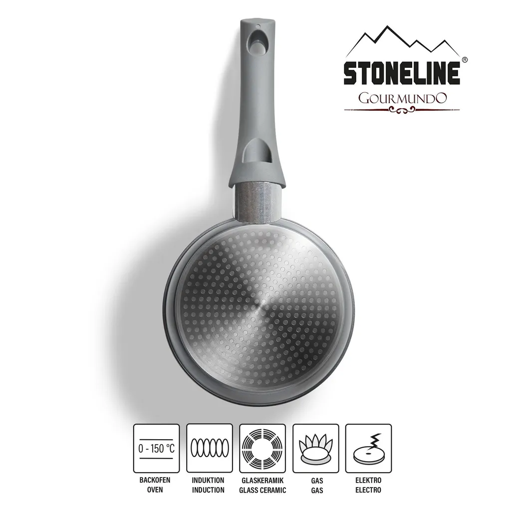 STONELINE - Оригинал! Здоровое приготовление и жарка без жира! Современный дизайн в сочетании с эргономичными ручками с мягким покрытием отличает сковороды серии STONELINE Gourmundo. Эта сковорода диаметром 16 см - незаменимый предмет на любой кухне. Она идеально подходит для очень небольших количеств блюд. Благодаря специальному антипригарному покрытию STONELINE, ваши блюда можно готовить как угодно - с жиром и маслом, так и без них, и они легко отделяются от посуды, не пригорая. Неважно, готовите ли вы на стеклокерамической, индукционной, электрической или газовой плите. К сковородам с оригинальным покрытием STONELINE не прилипают стойкие остатки пищи, а легкое мытье вручную экономит ваше время и силы. 1 сковорода для индукции, диаметр около 16 см, высота около 3,5 см, объем около 0,5 л; диаметр индукционного дна: около 13,5 см. Краткий обзор важнейших преимуществ посуды STONELINE: Единственное в мире антипригарное покрытие с частицами настоящего камня. Антипригарное покрытие STONELINE, устойчивое к царапинам. Сохранение витаминов при приготовлении и жарке без жира и масла. Оптимальные результаты жарки и хрустящее мясо. Подходит для вегетарианцев: овощи остаются хрустящими и сочными. Ничего не пригорает и не прилипает. Очень легко мыть. Сверхпрочное, недеформирующееся дно. Толщина дна: около 4,8 мм. Подходит для всех типов варочных панелей, включая индукционные. Можно использовать в духовке при температуре до 150 °C. Материал: литой алюминий. Советы по очистке и уходу: Перед первым использованием рекомендуем тщательно вымыть посуду небольшим количеством воды с мягким моющим средством для посуды. Затем нанесите несколько капель растительного масла на покрытие с помощью бумажного полотенца. Для последующего использования вам не придется использовать жир и масло! Благодаря эффекту легкой очистки рекомендуется мыть вручную. Просто протрите горячей водой, моющим средством для посуды и мягкой губкой.