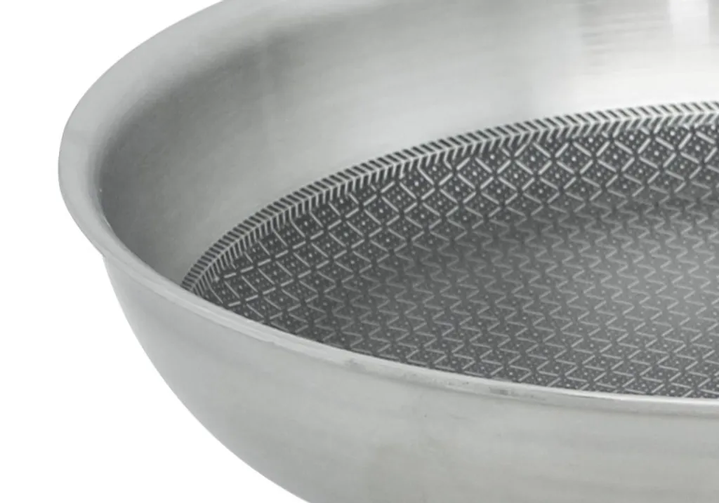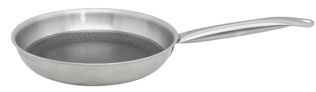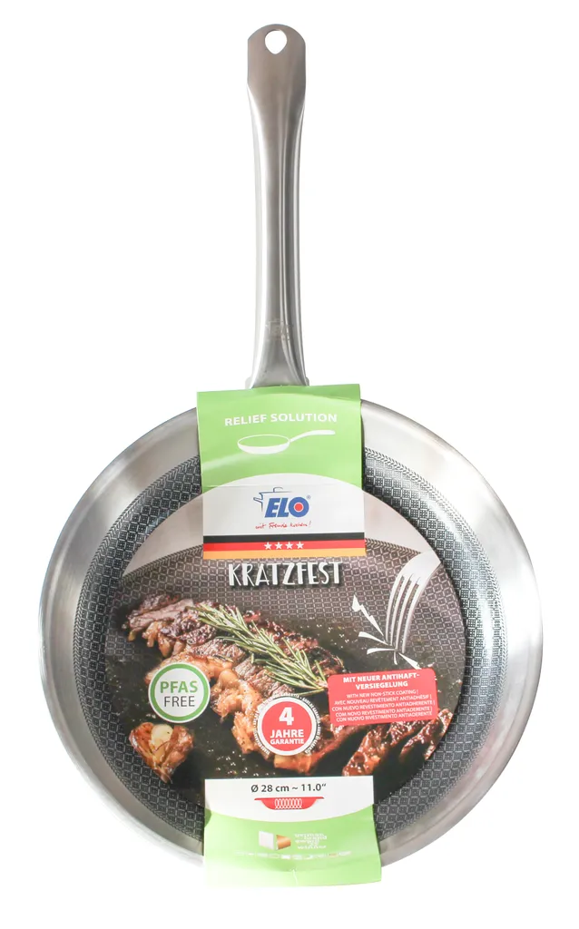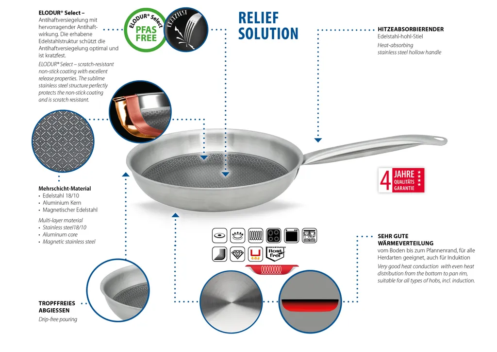 С сатинированной отделкой внутри и снаружи, Relief Solution впечатляет своей многослойной конструкцией: внутренняя часть выполнена из нержавеющей стали 18/10, сплошной алюминиевый сердечник и внешняя часть из магнитной нержавеющей стали обеспечивают равномерное распределение тепла от дна до края для идеальной жарки. Высококачественное антипригарное покрытие ELODUR Select устойчиво к царапинам, к нему ничего не пригорает, и его можно использовать в духовке при температуре до 240 °C. Специальный ободок предотвращает проливание, а полая ручка из нержавеющей стали удобно лежит в руке.