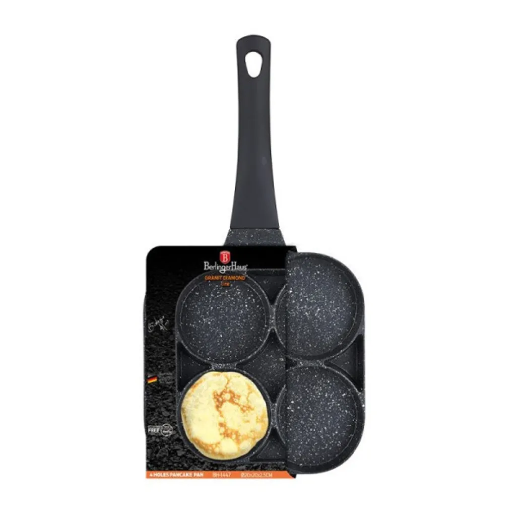 Berlinger Haus Granit Diamond Cookware Предлагает исключительную универсальность и удобство для повседневного использования. Идеальная сковорода для жарки блинов, пончиков, яиц или бургеров. Характеристики: Материал: высококачественный кованый алюминий, ферромагнитное основание из нержавеющей стали. Размер: 20 см x 20 см. Цвет: черный. Тройное гранитное антипригарное покрытие, чрезвычайно устойчивое к повреждениям. Не содержит вредных нитратов, кадмия и соединений свинца. Мягкая на ощупь силиконовая ручка. Можно мыть в посудомоечной машине. Подходит для всех типов плит: газовых, электрических, керамических, галогенных и индукционных. Ферромагнитное основание. Турбоиндукционная система (очень быстро нагревается), экономия энергии 35%. Granite покрытие - это тефлоновое покрытие, обогащенное гранитной пылью, что придает ему большую долговечность. Оно обеспечивает твердость. Оно тверже тефлона, но сохраняет его преимущества: не горит и хорошо распределяет тепло. Оно сочетает в себе преимущества чугунной и тефлоновой посуды. Оно обладает всеми преимуществами тефлона, но более устойчиво к повреждениям и даже превосходит керамические покрытия. Гранитное покрытие делает посуду исключительно устойчивой к царапинам и долговечной. Этот тип кастрюль и сковородок также позволяет жарить с минимальным количеством жира, поскольку посуда нагревается подобно камню и излучает тепло по всей своей поверхности. Сочетание алюминиевого корпуса и ферромагнитного основания позволяет использовать посуду на индукционных и всех других типах плит, а также использовать лучшие акакотермические свойства литого алюминия на всех типах плит и варочных панелей. Подходит для приготовления/жарки при температуре до 240 °C. - Материал: литой алюминий - Диаметр блинной сковороды. 20 * 2,2 см