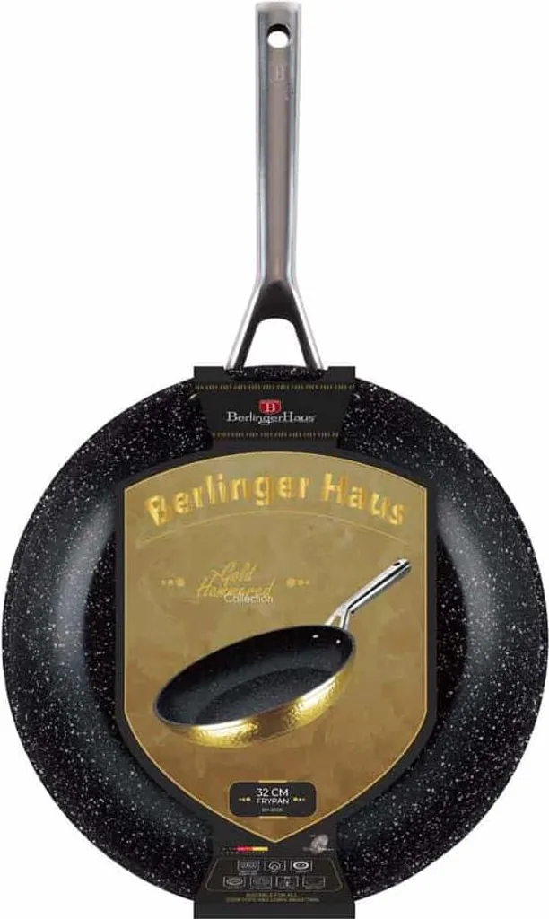 Коллекция: Кованое золото | Золотая элегантность и профессиональная производительность. Золотая элегантность в сочетании с профессиональной прочностью - для ежедневного успеха на кухне. Сковорода Berlinger Haus BH8009 идеально сочетает в себе дизайн, производительность и долговечность. Благодаря своему большому диаметру 32 см она идеально подходит для порций на всю семью, обжаренных овощей, мясных блюд, яичницы, паэльи или полноценных блюд на одной сковороде. Кованый алюминий и трехслойное мраморное антипригарное покрытие. Сковорода изготовлена из высококачественного кованого алюминия, что обеспечивает быстрое и равномерное распределение тепла. Благодаря тройному мраморному антипригарному покрытию любое блюдо готовится легко - с меньшим количеством жира, без пригорания и без утомительного оттирания. Устойчива к царапинам и термостойкая. Поверхность