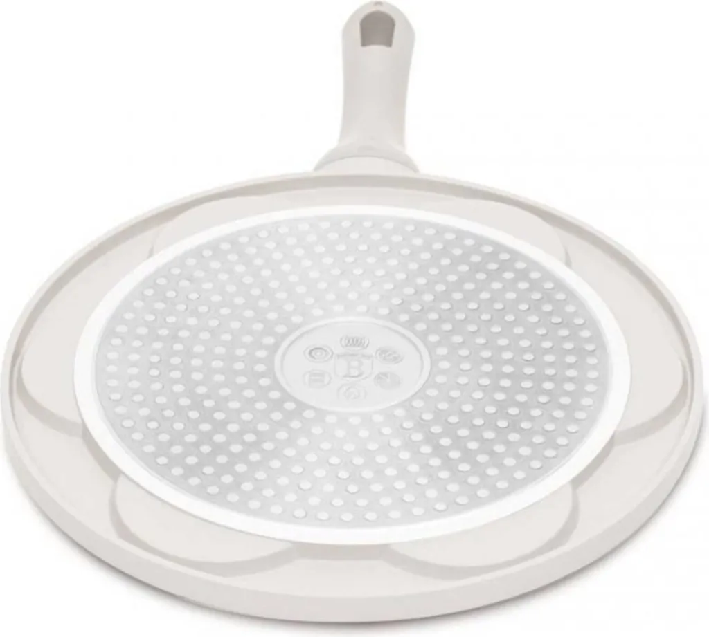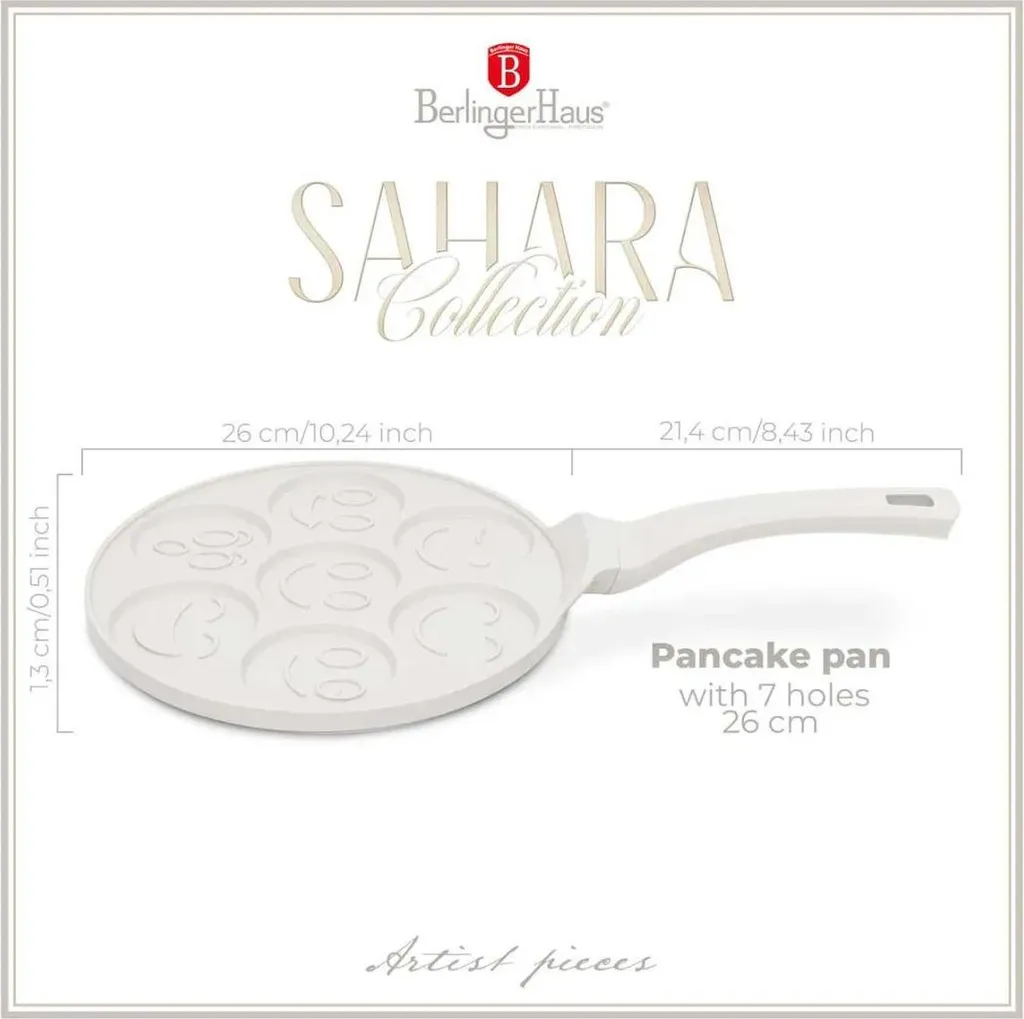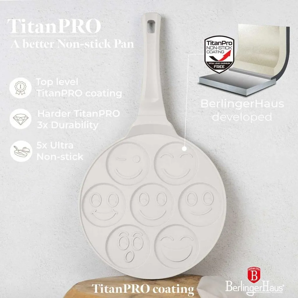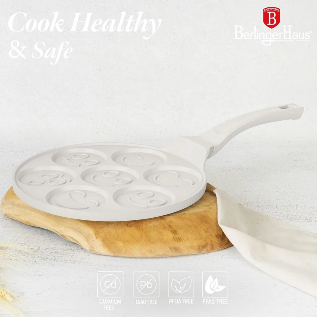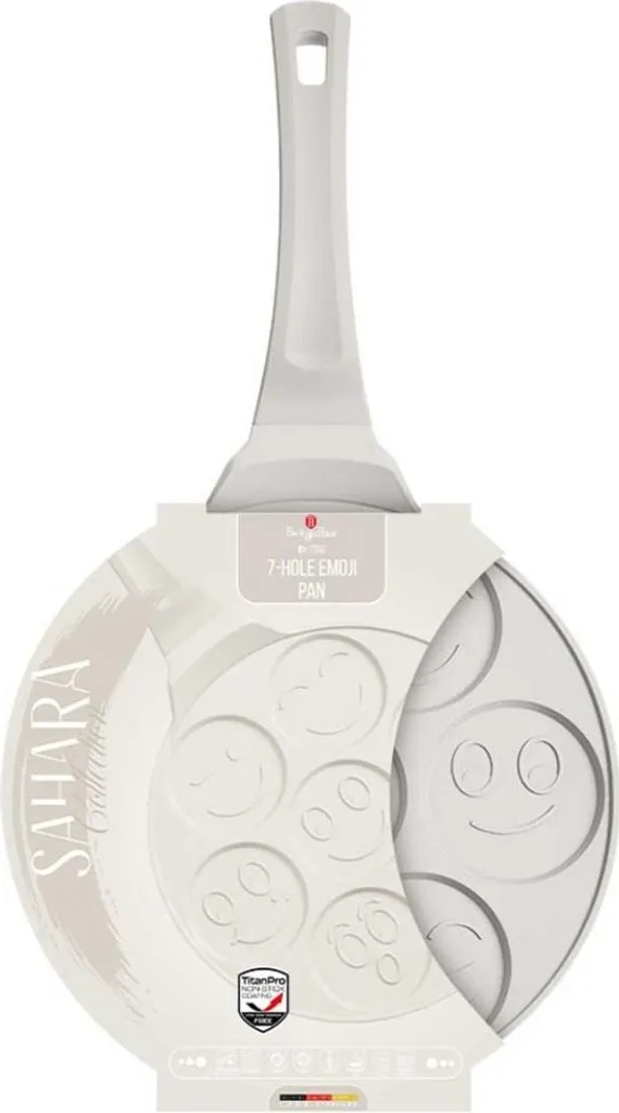 Кастрюли, сковородки и аксессуары серии BERLINGER HAUS SAHARA COLLECTION изготовлены из высококачественного алюминия и имеют тройное титановое покрытие TYTAN PRO с очень высоким коэффициентом твердости. Внешнее покрытие кремово-матовое. Подходит для всех типов плит: газовых, электрических, керамических, галогенных и индукционных. Благодаря системе ТУРБО-ИНДУКЦИЯ (очень быстрый нагрев) вы можете сэкономить до 35% энергии. Эта сковорода позволяет вам одновременно готовить 7 блинов с забавными эмодзи.