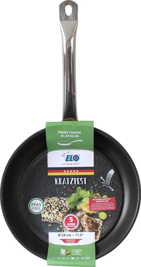 Описание продукта: Сковорода Professional Therm Platinum диаметром 24 см от ELO. Сковорода Professional Therm Platinum от ELO - идеальный выбор для ежедневного приготовления пищи и для требовательных поваров, которые ищут качественную и долговечную антипригарную сковороду. Изготовленная из полированной нержавеющей стали 18/10, она приятна на ощупь и благодаря высококачественному антипригарному покрытию ELODUR Professional позволяет легко готовить без пригорания. Разработанная для приготовления здоровой пищи с минимальным количеством жира, сковорода устойчива к царапинам и нагреванию. Полая ручка из нержавеющей стали с заклепками обеспечивает легкий и надежный захват. Подходит для всех плит, включая индукционные, и для использования в духовке при температуре до 240 °C. Простота ухода и возможность мытья в посудомоечной машине делают ее практичным помощником на любой кухне. Основные преимущества сковороды Profi Therm Platinum: Высококачественное антипригарное покрытие ELODUR Professional для легкого приготовления без пригорания; Устойчива к царапинам и подходит для высоких температур; Быстрое и равномерное распределение тепла благодаря капсулированному дну; Изготовлена из полированной нержавеющей стали 18/10; Подходит для всех типов варочных панелей, включая индукционные; Безопасна для использования в духовке при температуре до 240 °C; Эргономичная ручка из нержавеющей стали с заклепками для удобного захвата; Легко и быстро очищается, можно мыть в посудомоечной машине; Идеально подходит для приготовления пищи с небольшим количеством жира или без него; Не содержит вредных веществ. Характеристики сковороды Profi Therm Platinum: Серия: Profi Therm Platinum; Материал: нержавеющая сталь 18/8 - 18/10; Внутренняя поверхность: сатинированная с антипригарным покрытием ELODUR Professional; Внешняя поверхность: полированная; Диаметр: 24 см; Диаметр дна: 19,3 см; Высота: 5 см; Объем: 1,7 л; Толщина стенок: ок. 0,6 мм; Толщина дна: ок. 5,1 мм Длина ручки: 25 см Эргономичная полая ручка из нержавеющей стали, с заклепочным креплением Безопасно для использования в духовке при температуре до 240 °C Подходит для всех типов плит, включая индукционные Можно мыть в посудомоечной машине - не содержит вредных веществ ELO представляет новое поколение посуды с революционным антипригарным покрытием ELODUR. Это покрытие не содержит веществ, известных своей стойкостью в природе и потенциальным негативным воздействием на здоровье. Переход на нетоксичные технологии сочетает в себе высокое качество с устойчивым подходом, который защищает вас и окружающую среду. ELODUR Professional ELODUR Professional представляет собой вершину инноваций в области антипригарных покрытий. Оно не содержит ПТФЭ и фталатов и основано на минерально-керамической формуле. Эта поверхность была разработана для максимальной прочности и долговечности, поэтому отвечает требованиям даже самых взыскательных поваров. ELODUR Professional чрезвычайно устойчиво к царапинам и обеспечивает долговечный антипригарный эффект. Оно позволяет готовить с низким содержанием жира, а антипригарное покрытие значительно облегчает очистку. Исключительная износостойкость делает ее чрезвычайно долговечной и идеально подходящей для профессионального и интенсивного домашнего использования. Комплект поставки сковороды Profi Therm Platinum: 1 сковорода Profi Therm Platinum диаметром 24 см. Применение сковороды Profi Therm Platinum: Ежедневное приг
