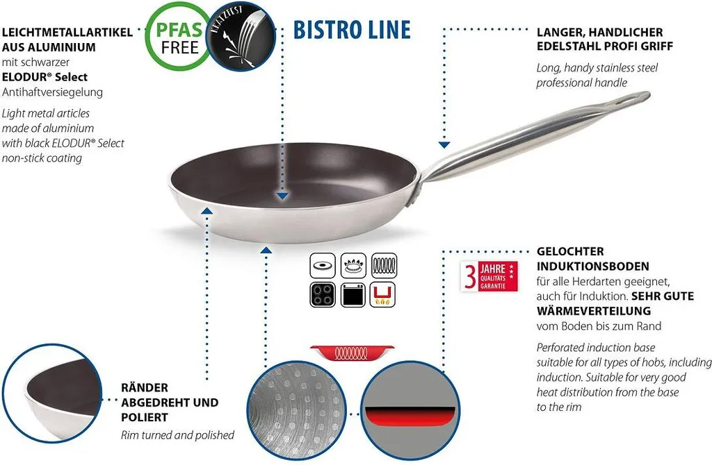 Сначала на плите, затем в духовке, и, наконец, на столе...? Вуаля, никаких проблем с серией кастрюль Bistro Line от ELO: эта легкая алюминиевая кастрюля практична внутри; все скользит плавно, ничего не пригорает, благодаря высококачественному, устойчивому к царапинам антипригарному покрытию ELODUR Select. Ее длинная ручка из профессиональной нержавеющей стали также удобна в использовании. Перфорированное индукционное дно подходит для всех типов варочных панелей и обеспечивает равномерное распределение тепла от основания до краев. Высококачественный алюминий. Внутренняя поверхность с высококачественным, черным, устойчивым к царапинам антипригарным покрытием ELODUR Select. Обточенные и полированные края. Длинная, удобная профессиональная ручка из нержавеющей стали. Высокая термостойкость. Идеально подходит для приготовления блюд с низким содержанием жира или без него. Можно использовать в духовке при температуре до 240 градусов. Легко чистить. Подходит для всех типов варочных панелей, включая индукционные. Описание товара: Сковорода Ø 32 см Bistro Line ELO. Сковорода Bistro Line от ELO - идеальный помощник для ежедневного приготовления пищи, впечатляющий не только своим высококачественным дизайном, но и практичностью в использовании. Изготовлена из цельного кованого алюминия, она легкая, но прочная. Благодаря высококачественному антипригарному покрытию ELODUR Select ничего не пригорает. Поверхность устойчива к царапинам и подходит для приготовления блюд с низким содержанием жира. Сковорода имеет длинную профессиональную ручку из нержавеющей стали, которая удобно лежит в руке и обеспечивает безопасное использование. Перфорированное индукционное дно обеспечивает равномерное распределение тепла по всей поверхности и подходит для всех типов варочных панелей, включая индукционные. Благодаря термостойкой конструкции сковороду можно использовать в духовке при температуре до 240 °C. Ее также можно мыть в посудомоечной машине. Основные преимущества сковород Bistro Line: Высококачественное антипригарное покрытие ELODUR Select - ничего не пригорает. Устойчива к царапинам и высоким температурам. Цельный кованый алюминий для оптимального распределения тепла. Длинная профессиональная ручка из нержавеющей стали для удобного захвата. Перфорированное индукционное дно для эффективного распределения тепла. Безопасно для использования в духовке при температуре до 240 °C. Легко моется, можно мыть в посудомоечной машине. Идеально подходит для приготовления здоровой пищи с минимальным потреблением жира. Подходит для всех типов варочных панелей, включая индукционные. Современный дизайн и практичная конструкция. Характеристики сковороды Bistro Line: Линия: Bistro Line. Материал: кованый алюминий. Внутренняя поверхность: ELODUR Select. Внешняя поверхность: полированный и укрепленный ободок. Диаметр: 32 см. Диаметр дна: 22 см. Высота: 5,5 см. Объем: 2,8 л. Толщина стенок: 4,0 мм. Толщина дна: 4,3 мм. Длина ручки: 25 см. Перфорированное индукционное дно. Длинная ручка из нержавеющей стали. Безопасно для использования в духовке при температуре до 240 °C. Можно мыть в посудомоечной машине. Подходит для всех Подходит для всех типов варочных панелей, включая индукционные - FREIELO представляет новое поколение посуды с революционным антипригарным покрытием ELODUR. Это покрытие не содержит веществ, известных своей стойкост