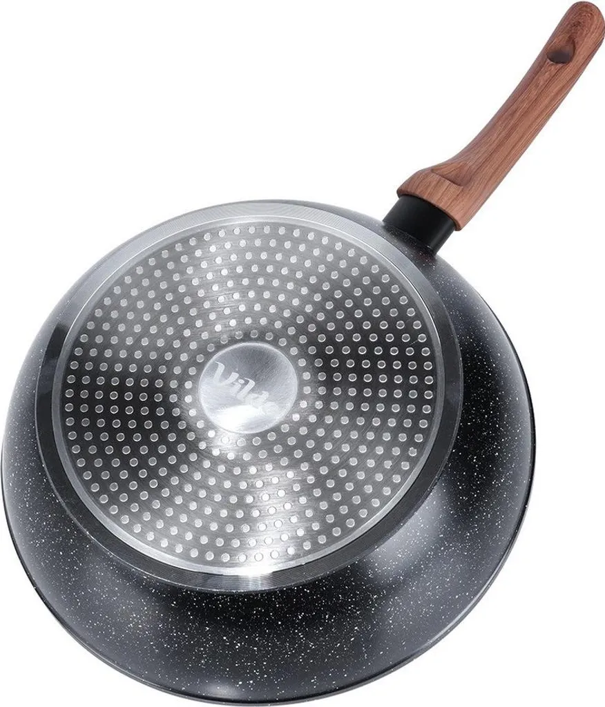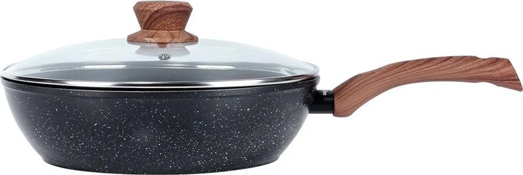 Антипригарное гранитное покрытие - Алюминиевая сковорода с черным антипригарным гранитным покрытием. Антипригарное покрытие позволяет готовить полезные и вкусные блюда с минимальным количеством жира. Сковорода и крышка имеют высококачественную, прочную ручку из пластика, имитирующего дерево.