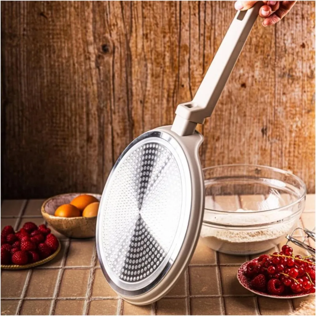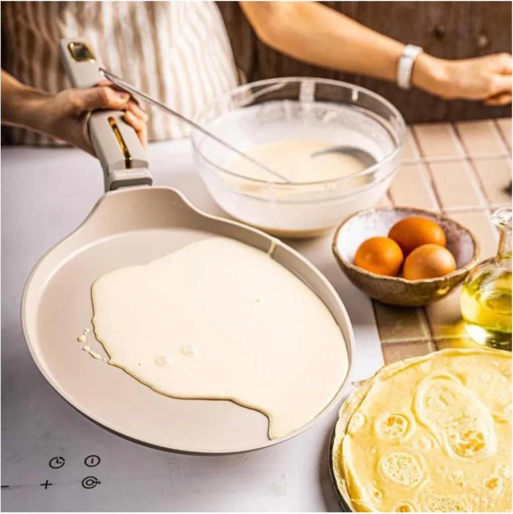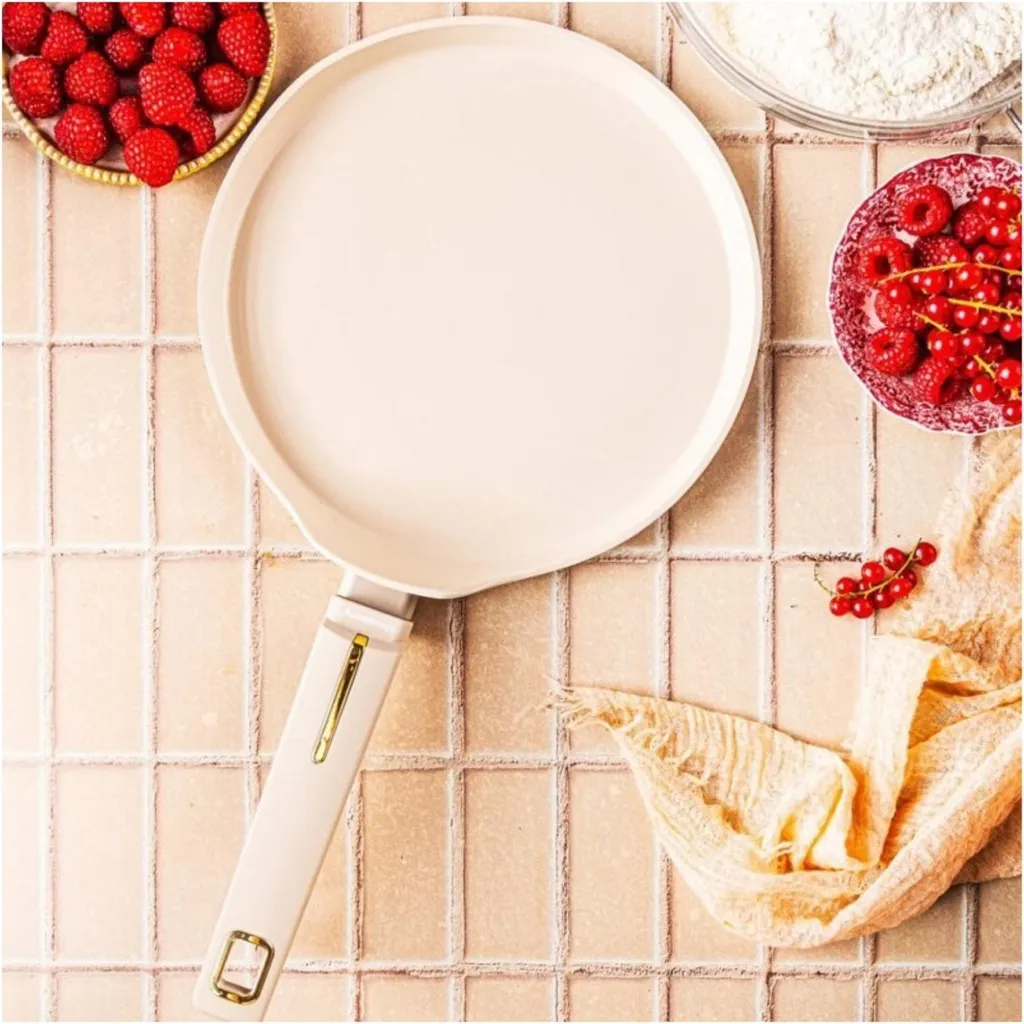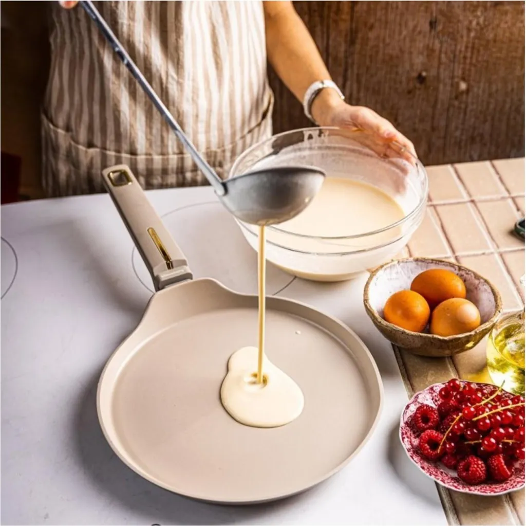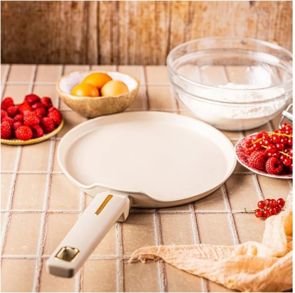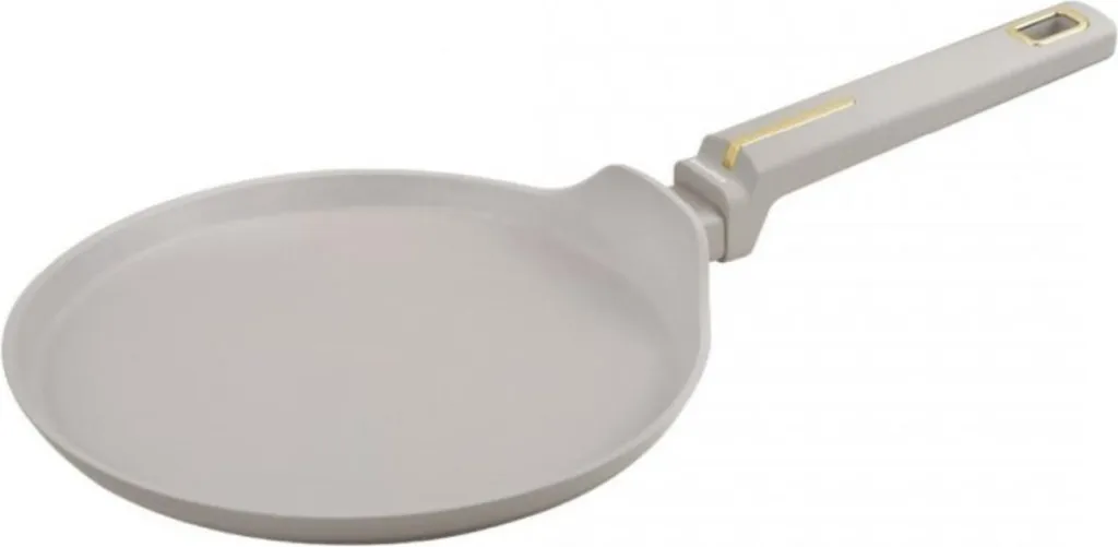 Антипригарное покрытие предотвращает пригорание, что особенно важно для тонких блинчиков. Она также подходит для приготовления омлетов, тортилий, роллов, яичницы и даже картофельных оладий. Благодаря своей элегантной поверхности сковорода отлично смотрится на кухонной столешнице - она выглядит так же хорошо, как и готовится. Характеристики и особенности: Идеально подходит для блинов, оладий и блинчиков. Рабочий диаметр 24 см - идеально подходит для завтрака и десертов. Высота бортиков около 1,7 см - блинчики легко переворачиваются. Антипригарное покрытие - готовьте без пригорания и масла. Дно с превосходной теплопроводностью - равномерное распределение тепла без холодных участков. Эргономичная ручка с золотыми вставками - удобная и элегантная.