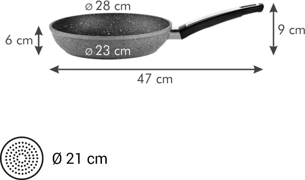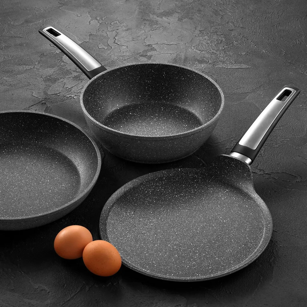 Прочная сковорода с уникальным шероховатым антипригарным покрытием, напоминающим неполированный натуральный камень. Специальная структура поверхности обеспечивает равномерное прожаривание без пригорания, сохраняя естественный и сочный вкус блюд. Подходит для всех типов плит: электрических, газовых, стеклокерамических и индукционных. Можно мыть в посудомоечной машине.
