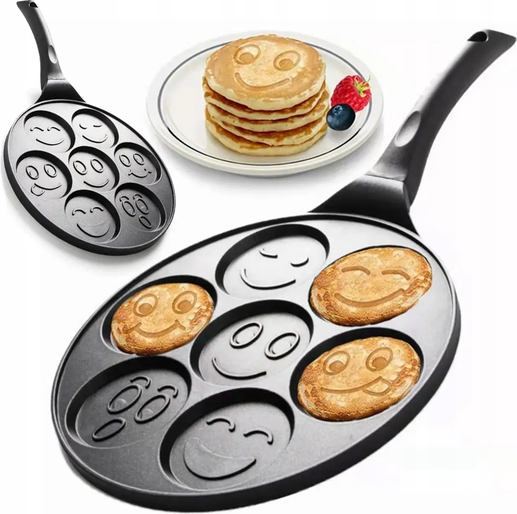 26 см антипригарная сковорода для яиц и блинов. Подходит для газовых, галогенных и электрических лампочек. Подойдет для любой кухни. Если у вас есть дети, вы не можете пропустить этот гаджет. Эмодзи не только побуждают детей есть, но и вдохновляют взрослых на украшение. Это улучшит настроение вам и вашим близким при подаче еды. 7 эмоций для 7 блинов/яиц - используются для приготовления 7 яичниц или 7 блинов одновременно. Позволяет быстро и без вреда для здоровья жарить. Характеристики: Материал: алюминий + нержавеющая сталь; Покрытие: антипригарное; Цвет: черный; Размеры блина: 6,5 см; Вес: 1,096 кг; Вес упаковки: 1,196 кг; В комплект поставки входят: сковорода, ручка, упаковка. Ваши дети тоже привередливы в еде? Это побудит даже самого привередливого едока поесть. Улыбающийся омлет или блинчик делают время приема пищи намного приятнее и побуждают к еде. Украшение и поедание блинов - величайшая радость для ребенка. Улыбка, нарисованная фруктами, и рисование глаз джемом или шоколадной пастой станут настоящим хитом за обедом. Преимущества: 7 блинов за раз, диаметр 26 см, съемная ручка, подходит для всех типов плит, антипригарное покрытие. Удобно держать: ручка не скользит в руке. Она также съемная, поэтому вам не придется беспокоиться о том, что блины займут много места в шкафу. Улыбающиеся блины: блины, которые улыбаются, высовывают языки или подмигивают, сделают ужин восхитительным. Веселые рисунки на этих блинах побуждают есть и заряжают позитивной энергией на весь день. Покрытие исключительно прочное и безопасное в использовании.