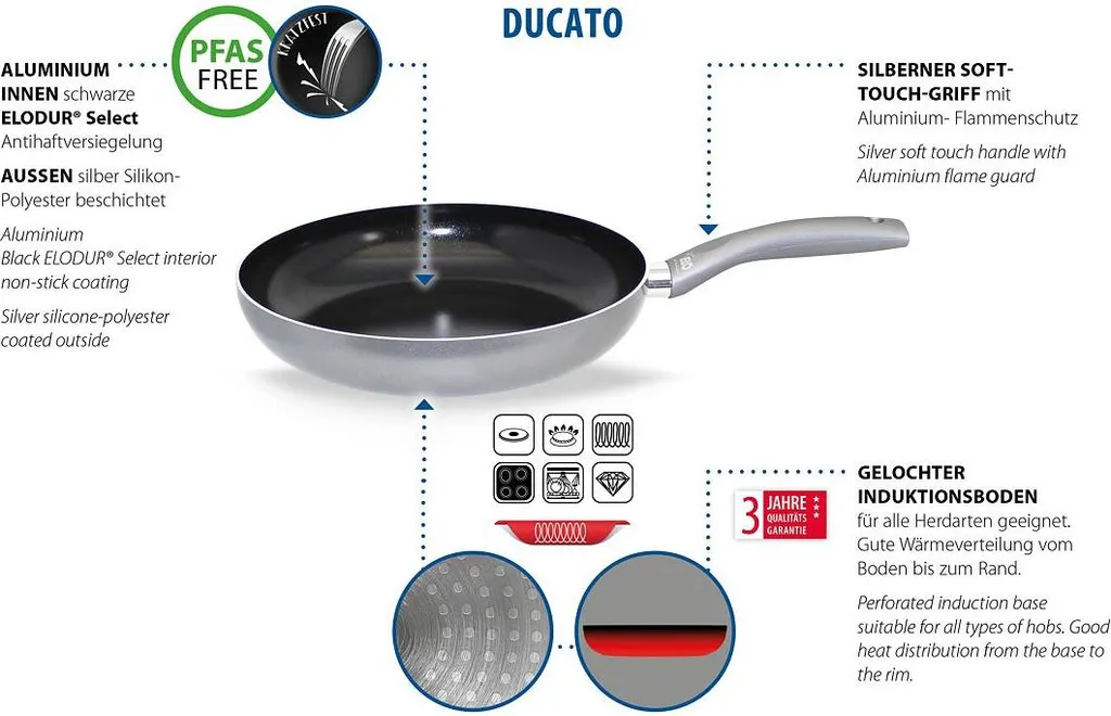 Сковорода ELO Ducato изготовлена из прочного алюминия, что обеспечивает легкость и эффективное распределение тепла.