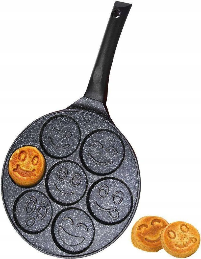 26 см антипригарная сковорода для яиц и блинов. Подходит для газовых, галогенных и электрических лампочек. Подойдет для любой кухни. Если у вас есть дети, вы не можете пропустить этот гаджет. Эмодзи не только побуждают детей есть, но и вдохновляют взрослых на украшение. Это улучшит настроение вам и вашим близким при подаче еды. 7 эмоций для 7 блинов/яиц - используются для приготовления 7 яичниц или 7 блинов одновременно. Позволяет быстро и без вреда для здоровья жарить. Характеристики: Материал: алюминий + нержавеющая сталь; Покрытие: антипригарное; Цвет: черный; Размеры блина: 6,5 см; Вес: 1,096 кг; Вес упаковки: 1,196 кг; В комплект поставки входят: сковорода, ручка, упаковка. Ваши дети тоже привередливы в еде? Это побудит даже самого привередливого едока поесть. Улыбающийся омлет или блинчик делают время приема пищи намного приятнее и побуждают к еде. Украшение и поедание блинов - величайшая радость для ребенка. Улыбка, нарисованная фруктами, и рисование глаз джемом или шоколадной пастой станут настоящим хитом за обедом. Преимущества: 7 блинов за раз, диаметр 26 см, съемная ручка, подходит для всех типов плит, антипригарное покрытие. Удобно держать: ручка не скользит в руке. Она также съемная, поэтому вам не придется беспокоиться о том, что блины займут много места в шкафу. Улыбающиеся блины: блины, которые улыбаются, высовывают языки или подмигивают, сделают ужин восхитительным. Веселые рисунки на этих блинах побуждают есть и заряжают позитивной энергией на весь день. Покрытие исключительно прочное и безопасное в использовании.