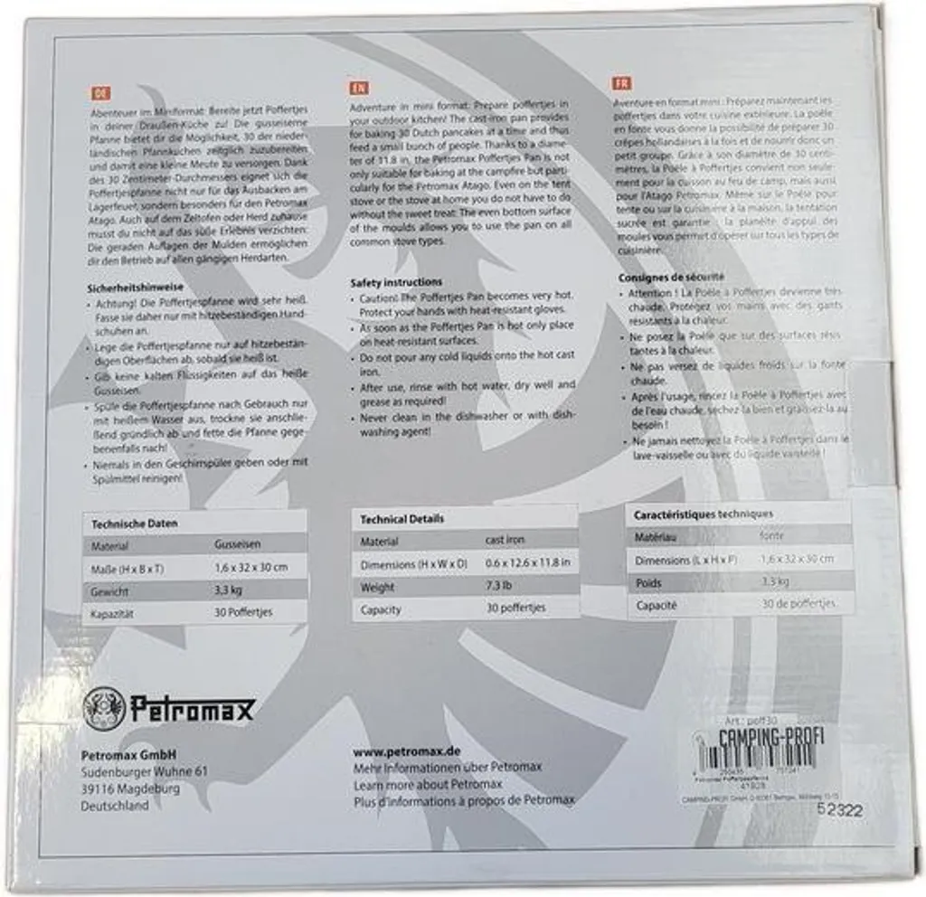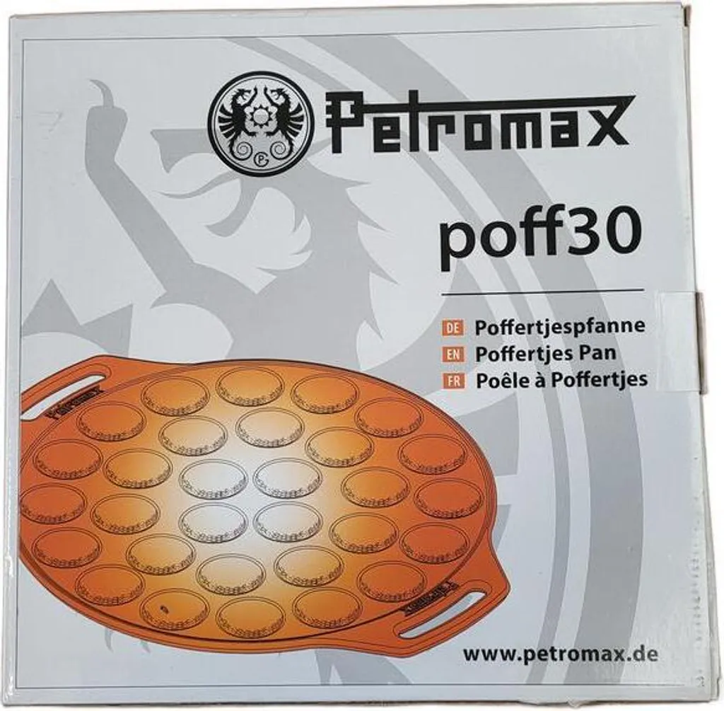 Ее можно легко перемещать с помощью двух боковых ручек. Благодаря диаметру 30 см она идеально подходит для Petromax Atago и может быть размещена на верхнем краю. Нижние стороны 30 ячеек для выпечки специально сплющены, поэтому форму poffertjes можно использовать дома в духовке и на всех распространенных типах варочных панелей. Технические данные: Материал: чугун; Размеры (В x Ш x Г): 1,6 x 32 x 30 см; Вес: 3,3 кг; Вместимость: 30 poffertjes; Комплект поставки: 1x Сковорода Petromax Poffertjes Poff30; Чугунная сковорода для поффертье Petromax: Чугунная сковорода для поффертье Petromax - идеальный способ приготовить вкусные поффертье на открытом огне. Эта высококачественная чугунная сковорода обеспечивает равномерное распределение тепла, поэтому ваши поффертье готовятся идеально. Качественные поффертье: Высококачественный чугун обеспечивает равномерное распределение тепла и позволяет готовить 30 поффертье одновременно. Это достигается благодаря обработке сковороды специальным маслом, которое предотвращает появление ржавчины и защищает материал, поэтому поффертье не пригорают. Легко чистить: Сковороду легко мыть теплой водой с мылом. Дополнительные чистящие средства не нужны, так как они могут повредить защитное покрытие. Кратко о держателе для сковороды Petromax: Бренд отличается своим акцентом на качестве и долговечности своей продукции. История бренда восходит к началу XX века, когда он сосредоточился на разработке масляных ламп. Dutch Treats! Сковорода для поффертье - это увлекательный способ выпекать на открытом воздухе. Вы можете испечь 30 таких голландских деликатесов одновременно для всей семьи. Диаметр сковороды составляет 30 см, и она изготовлена из чугуна, что типично для посуды такого типа. Ее размер позволяет легко использовать ее с грилем Petromax Atago, а также на дровах или углях. Продуманная конструкция позволяет ровно разместить сковороду на противне или плите благодаря плоскому дну. Ищете универсальную и прочную посуду для приготовления блюд на свежем воздухе? Тогда чугунная сковорода-гриль Petromax размером 42 x 1,8 x 1,8 мм - именно то, что вам нужно.