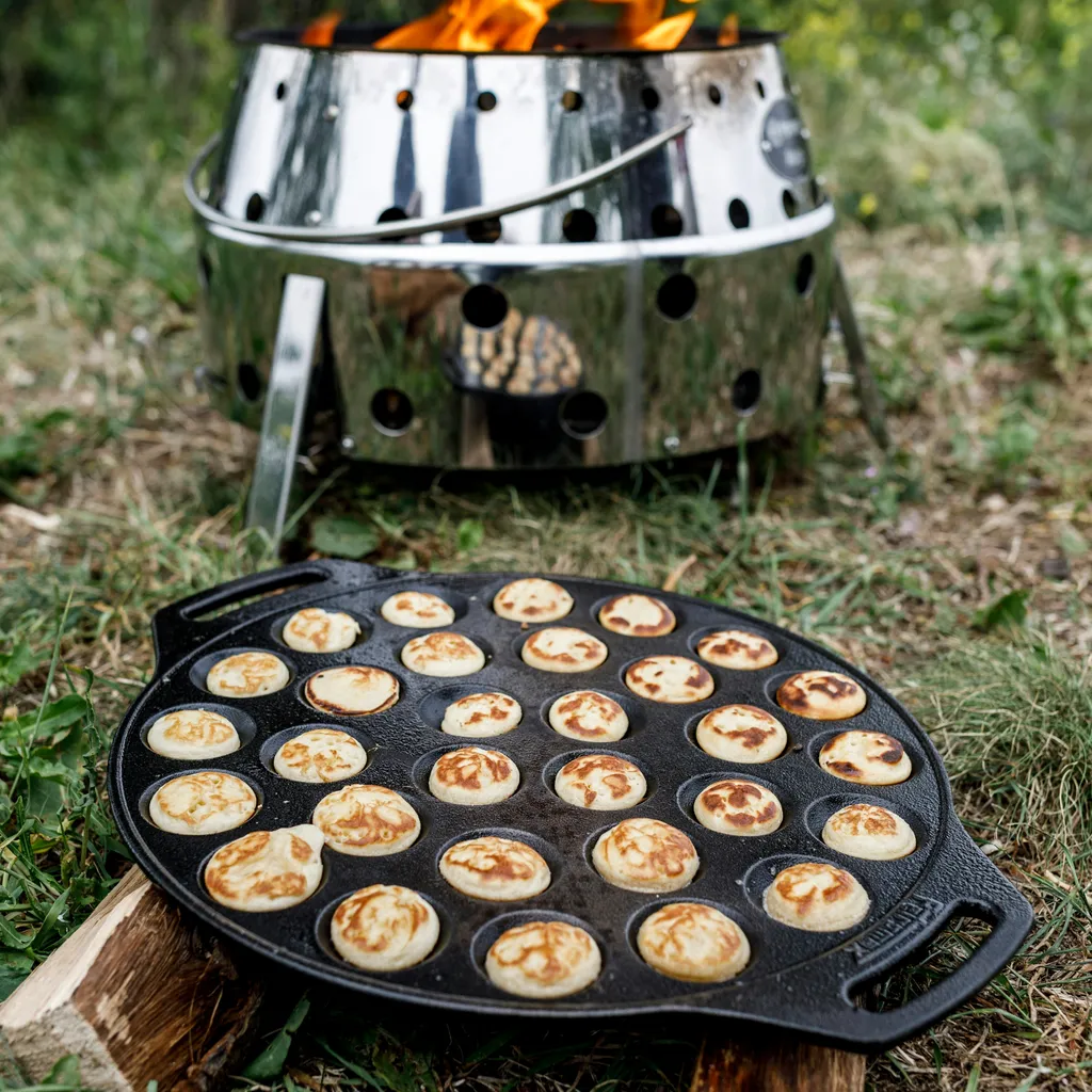 Для смелых вкусов в маленьких порциях: сковорода poffertjes поможет вам приготовить необыкновенный десерт у костра и, несомненно, порадует детей. Благодаря специальной чугунной сковороде вы можете испечь 30 таких голландских мини-блинчиков за один раз в мгновение ока. Отличная теплопроводность чугунной сковороды poffertjes также обеспечивает равномерное пропекание.