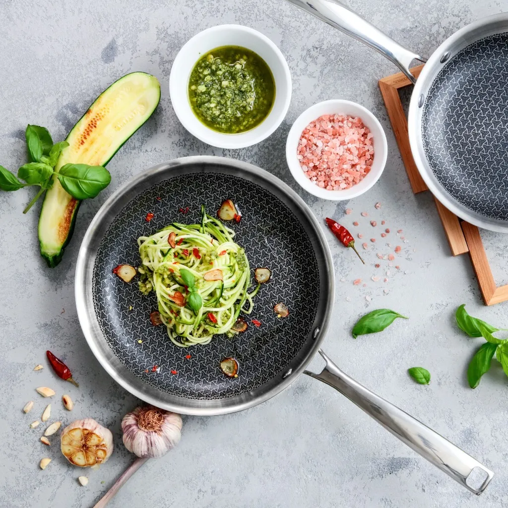 Трехслойные стальные сковороды с антипригарным покрытием. Что отличает сковороды SteelCRAFT? Они сочетают в себе преимущества классических стальных сковород без антипригарного покрытия с преимуществами наиболее часто используемых антипригарных сковород на кухне. Благодаря многослойной конструкции сковороды SteelCRAFT быстро и равномерно распределяют тепло по всей поверхности. Уникальная антипригарная поверхность с рельефной сеткой из нержавеющей стали обеспечивает интенсивное и равномерное прожаривание без пригорания. Мелкая стальная сетка создает идеальную хрустящую корочку при жарке мяса. Карамелизированный жир отлично подходит для соусов. Антипригарные сковороды SteelCRAFT идеально подходят для всех распространенных блюд, жаренных на сковороде, особенно для стейков. Антипригарное покрытие сковород SteelCRAFT устойчиво к металлической посуде, и сковороды подходят для всех типов плит, включая индукционные. Благодаря цельнометаллической конструкции и водостойкой ручке из нержавеющей стали сковороды SteelCRAFT также можно использовать для выпечки в духовке. Они огнеупорны до температуры 230 °C.