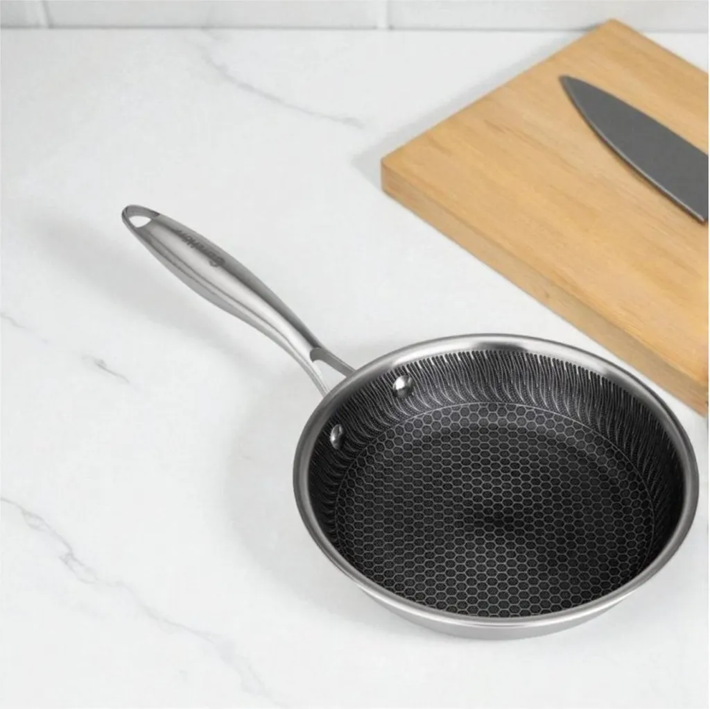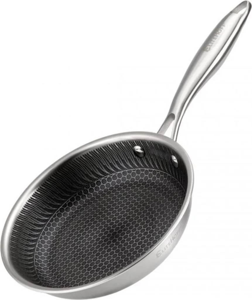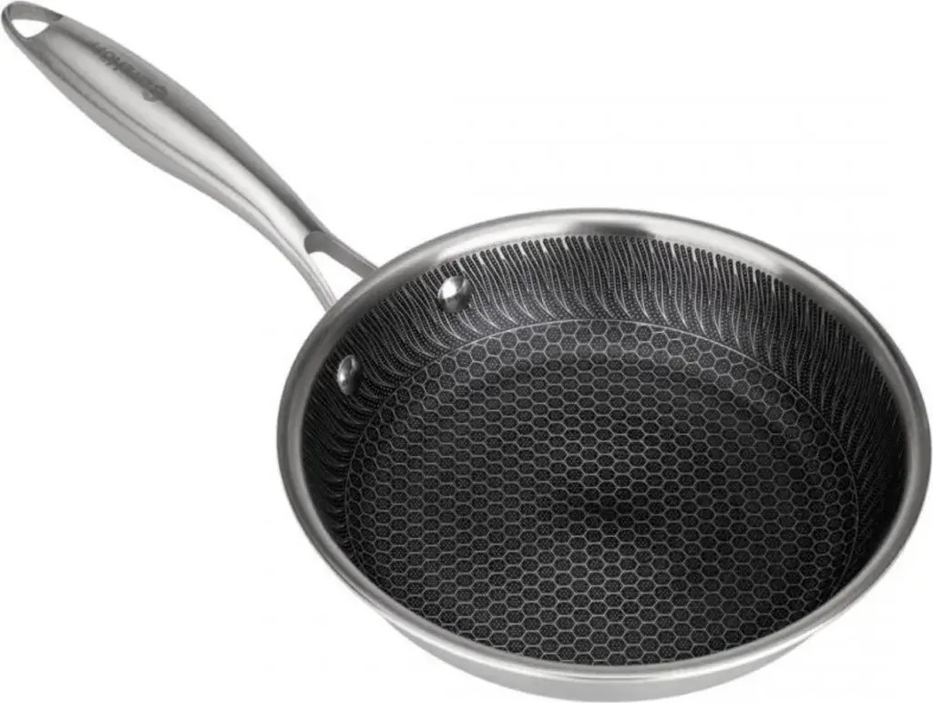 Покрытие позволяет жарить более здоровую пищу с минимальным количеством жира и предотвращает пригорание пищи. Преимущества стальной сковороды с сотовым покрытием: Прочная конструкция из нержавеющей стали, инновационная поверхность с сотовой структурой, устойчивость к царапинам и повреждениям, заклепочная ручка, возможность жарить с минимальным количеством жира, равномерный нагрев и удержание тепла, совместимость со всеми типами варочных панелей, включая индукционные. Легко чистить и гигиенично использовать. Размер: Ø20 x 4,5 см. Сковорода с покрытием Honeycomb - отличный выбор как для профессиональной кухни, так и для повседневного домашнего использования. Она сочетает в себе современный дизайн, функциональность и долговечность, обеспечивая долгие годы комфортной готовки.