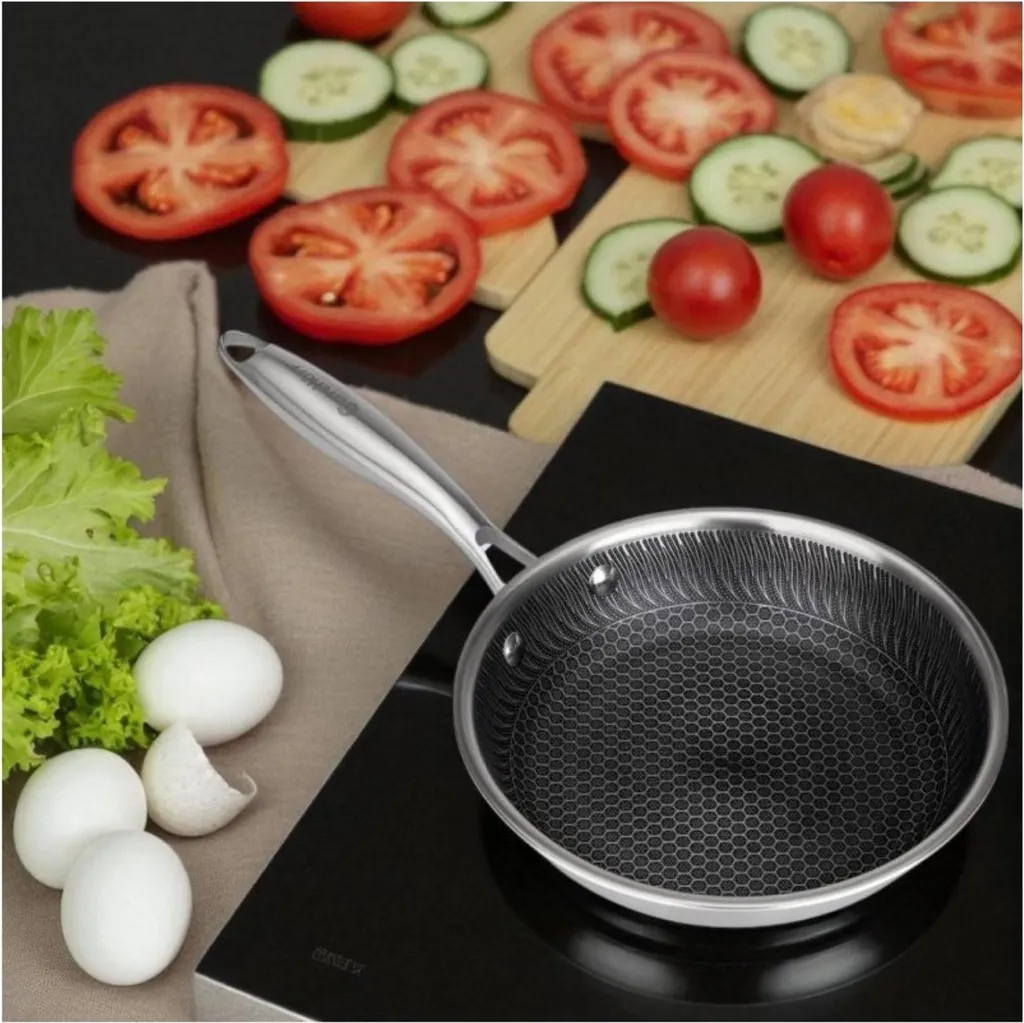Стальные сковороды с сотовым покрытием - это современная кухонная утварь, предназначенная для интенсивного использования. Изготовленные из высококачественной нержавеющей стали, они исключительно устойчивы к механическим повреждениям и высоким температурам. Их поверхность покрыта специальной сотовой структурой, которая защищает антипригарное покрытие.