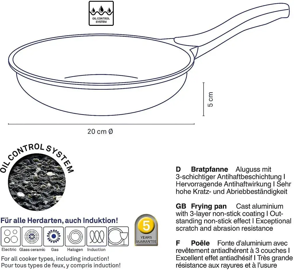 Сковорода имеет уникальную систему каналов для масла/жира. Система контроля масла обеспечивает равномерное распределение масла или жира по всему дну. Пища практически плавает над маслом с минимальным контактом. Сковороду можно мыть в посудомоечной машине и использовать в духовке при температуре до 180 градусов Цельсия.