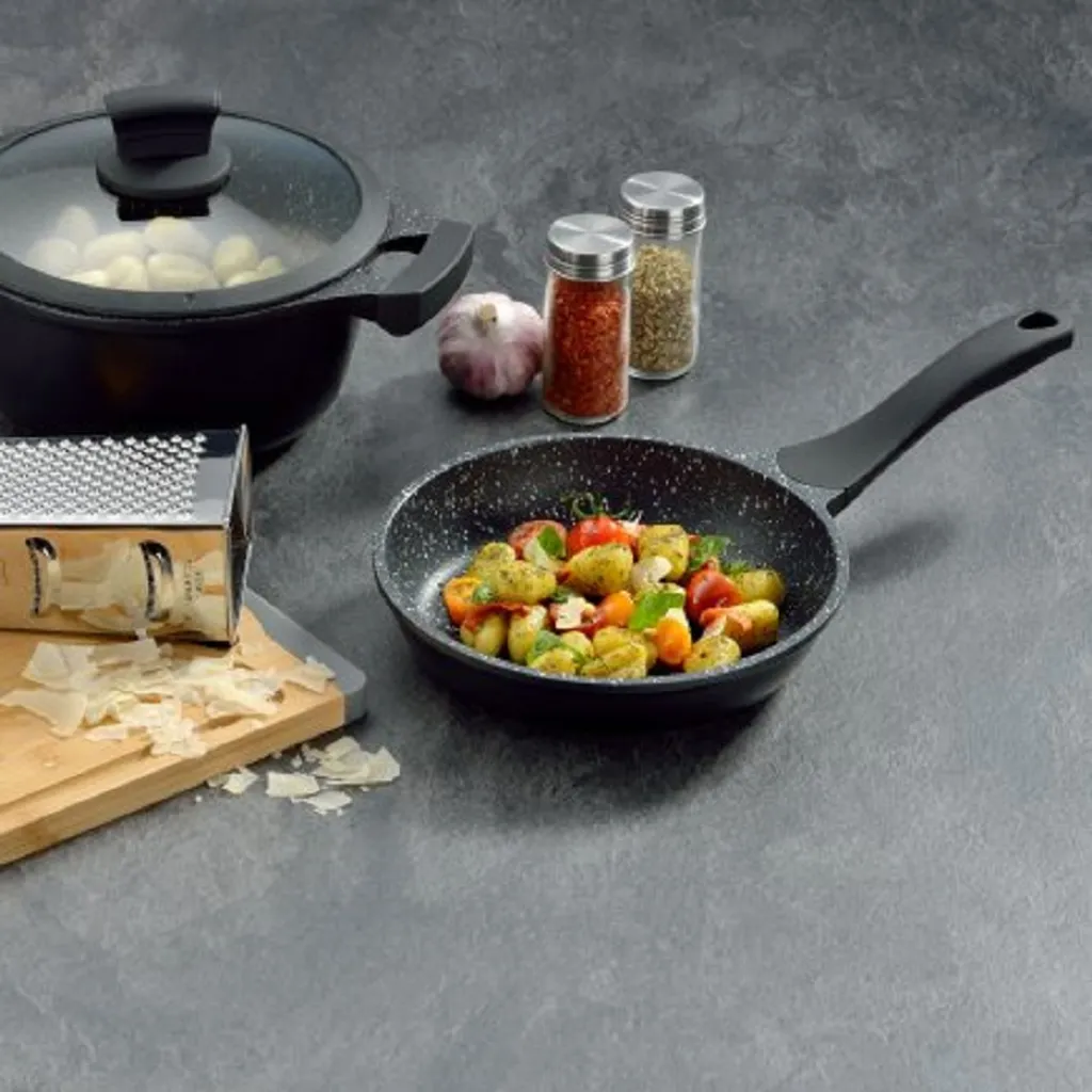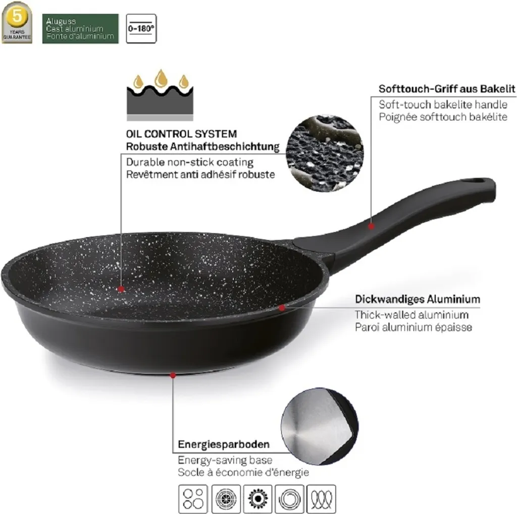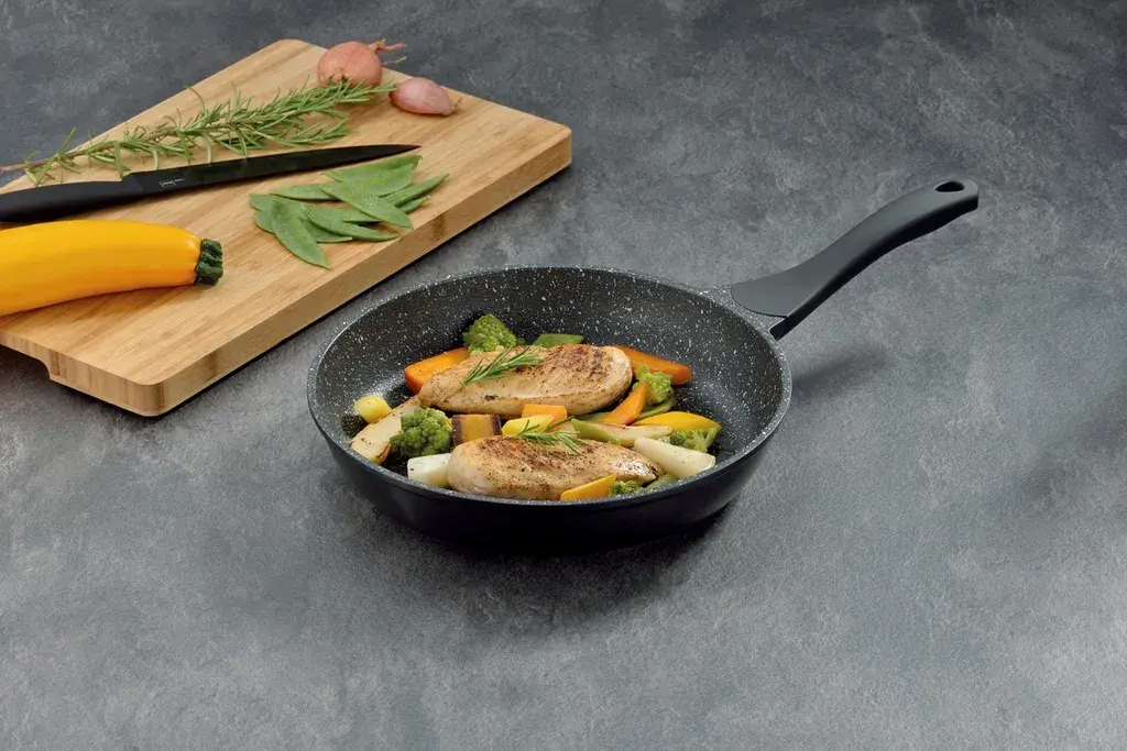- Подходит для приготовления здоровой пищи с минимальным количеством жира. В зависимости от ингредиентов, ее можно использовать даже без жира. - Корпус из литого алюминия устойчив к царапинам, быстро нагревается и обладает отличной теплопроводностью. в руке, остается прохладной и не пригорает - Сковорода подходит для всех типов плит и индукционных