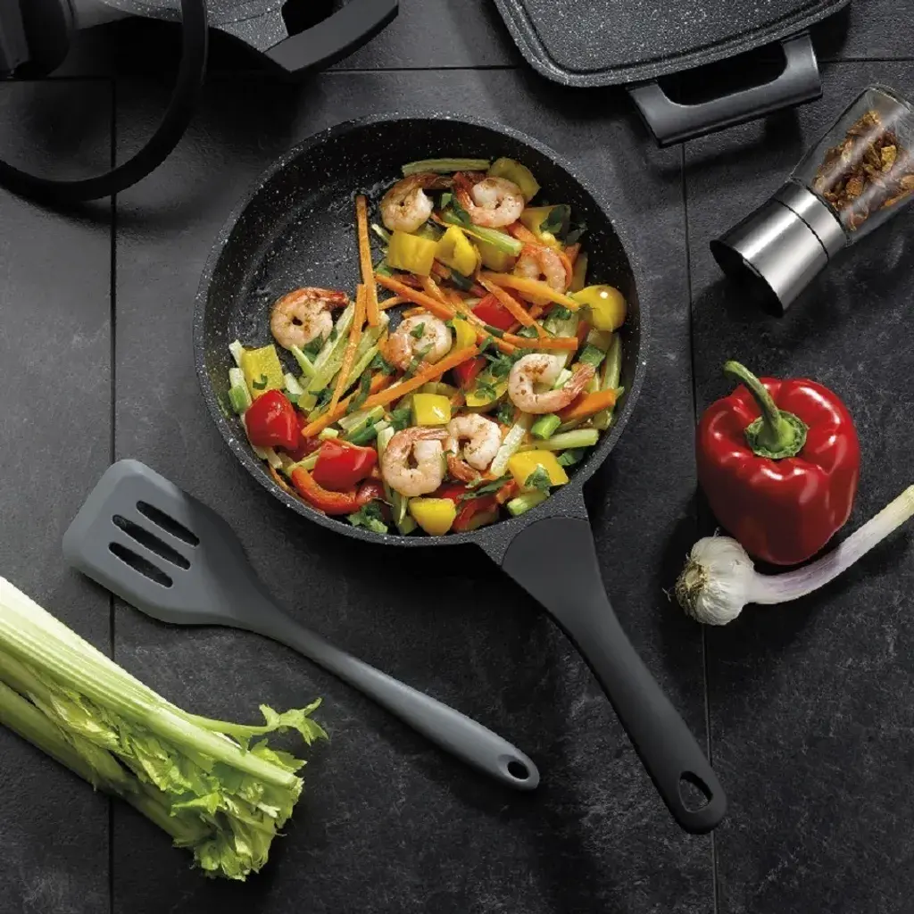 Антипригарное покрытие позволяет жарить нежные продукты, такие как омлеты или рыбу, а текстурированная поверхность придает еде хрустящую корочку.